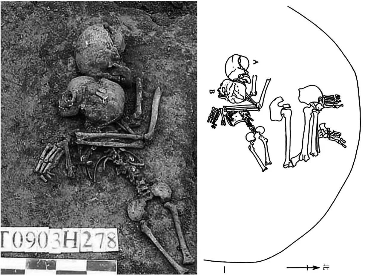 H278(殷墟四期)是一座规范的祭祀坑,也保留着虐杀的现场。坑中埋有一具成年男性尸骨,怀中紧抱一具幼儿尸骨。成年男性被从腰部砍断,下半身和上半身并排放置,大腿和小腿被紧密折叠在一起,脚跟紧贴骨盆;上半身只剩头部和残缺的两臂,颈椎、肋骨和一只手被砍掉,但他仍用残余的胳膊紧抱幼儿。
