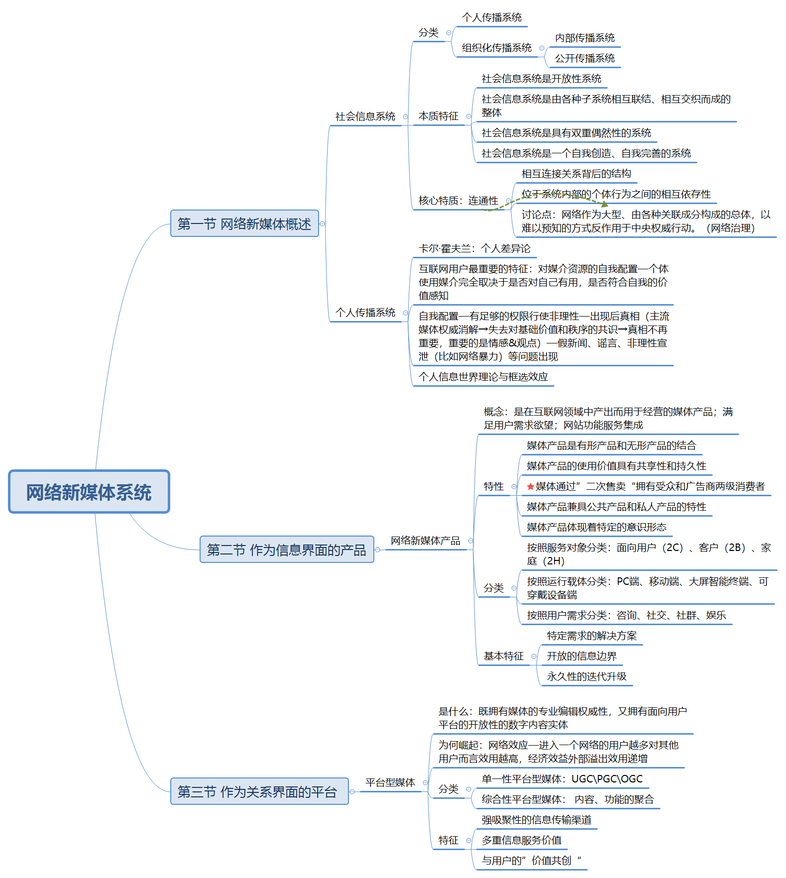 2. 第一节介绍网络新媒体系统。第一点需要关注的是社会信息系统的4个本质特征:开放性、各种子系统相互联结交织、双重偶然性、自我创造完善性。社会信息系统的连通性一方面依托于个体之间的相互依托性。另一方面,因网络关联多个主体的复杂性和难以预知性带来的社会问题,诸如公共讨论、网络暴力等等,引发了如何进行网络治理的相关研究。第二点介绍的是个人信息系统。与传统媒体相比,新媒体的传播模式发生了很大的变化。用户基于自身的兴趣和关系网建构差异化的信息渠道,形成个人传播系统。而建立个人传播系统的决策基准是尚有缺陷、不够理智的个人心智。在新媒体赋权之下,会加速后真相时代的到来。后真相时代指的是真相没有被篡改,依然存在,只是变得次要了。而当下网络环境中网络暴力频发、假新闻甚嚣尘上等问题归根究底与后真相时代这一语境息息相关。