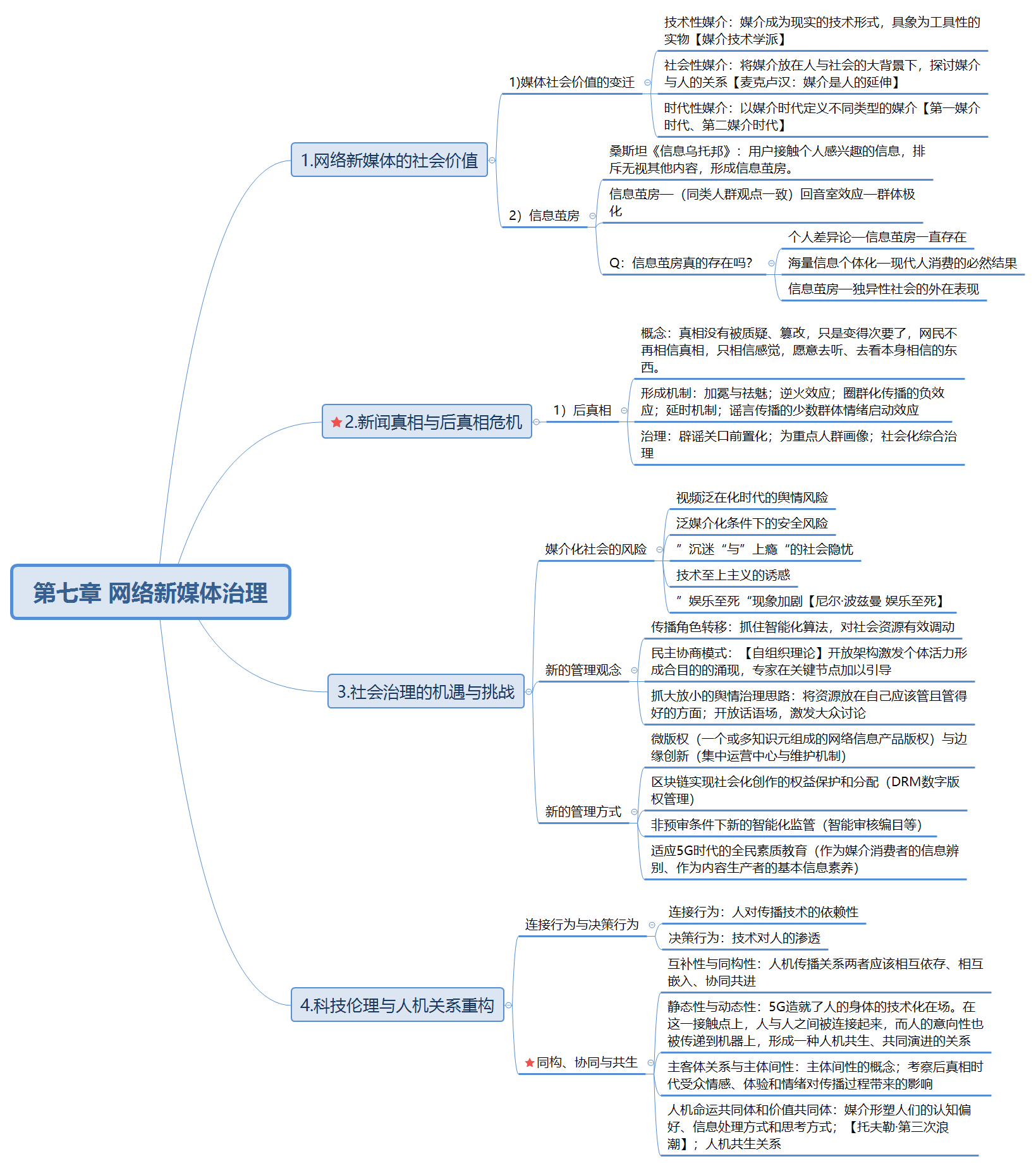 3. 第二节是重点。后真相在第二章有提到过,大家可以比照学习。后真相的形成机制包括加冕与祛魅、逆火效应、圈群化传播的负效应、延时机制、群体情绪启动效应等等。但这里注意,虽然谣言要加以管制,但谣言不是纯负面的概念,从社会心理的角度来说,谣言的传播代表一种社会对抗,是大众反叛权威发表意见的途径。因此在谈及谣言治理问题时注意更理性客观地分析,不能完全站在批判的视角哦。后真相的治理部分根据书内论点提炼治理措施整合背诵即可。