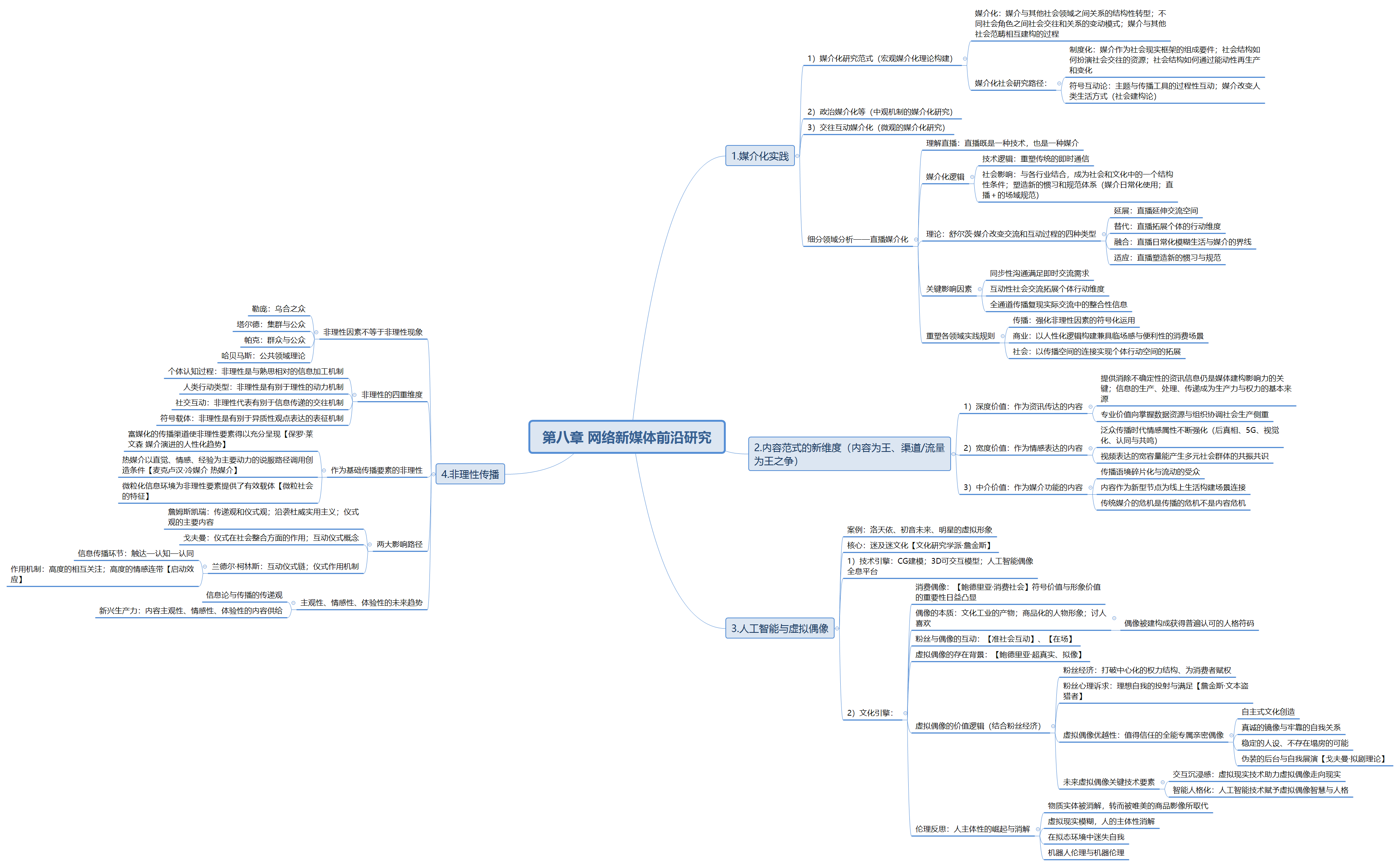 1. 新媒体前沿研究中媒介化是无可回避的社会演进趋势。媒介化意味着作用于人类社会形态的媒介形式不仅作为功能出现,而是以媒介逻辑形塑着社会文化与行动领域。媒介化社会的两种路径,其一是将媒介视作现实的组成要件,阐释社会结构对社会交往的影响以及社会结构的再生产。其二是符号互动论传统,认为人类可以使用媒介改变社会的建构方式。第二部分详细介绍了直播的媒介化实践,其中舒尔茨提出的延展、替代、融合与适应四个方面需要重点掌握,了解直播如何从这四个方面改变了社会交往实践。此外,同步沟通、互动交流、全通道传播也是直播的技术特点,可以结合第六章整合梳理直播带货的相关笔记。