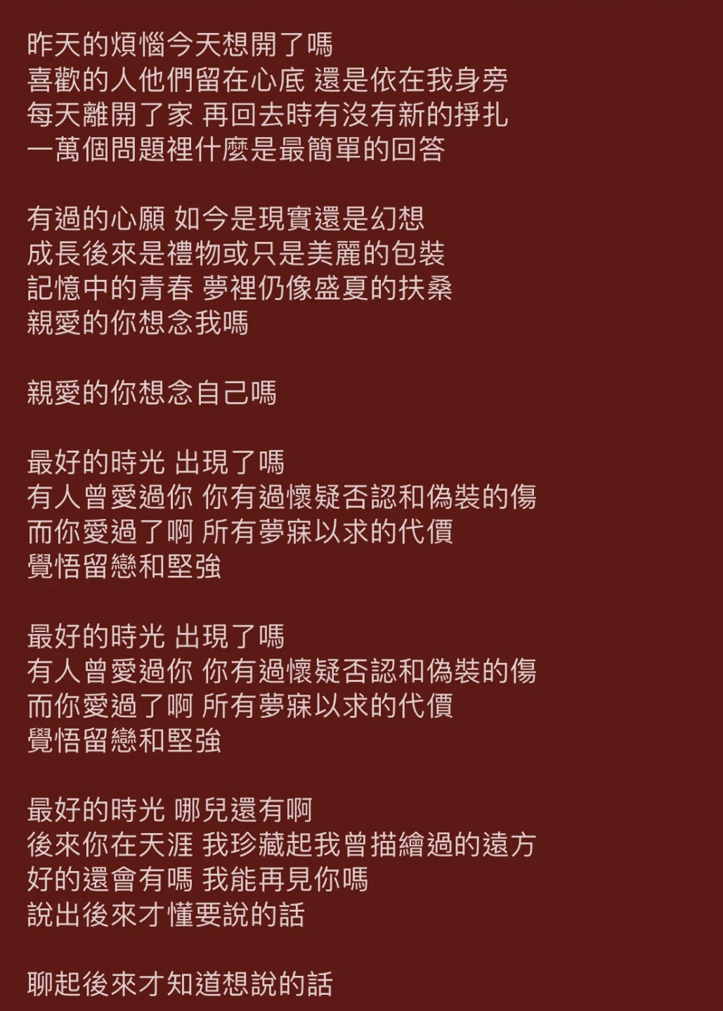 今天恰巧早上起床收到了朋友发的一首歌《眼泪落下之前》,以及前阵子台湾金曲奖上触动我的那首《最好的时光》。