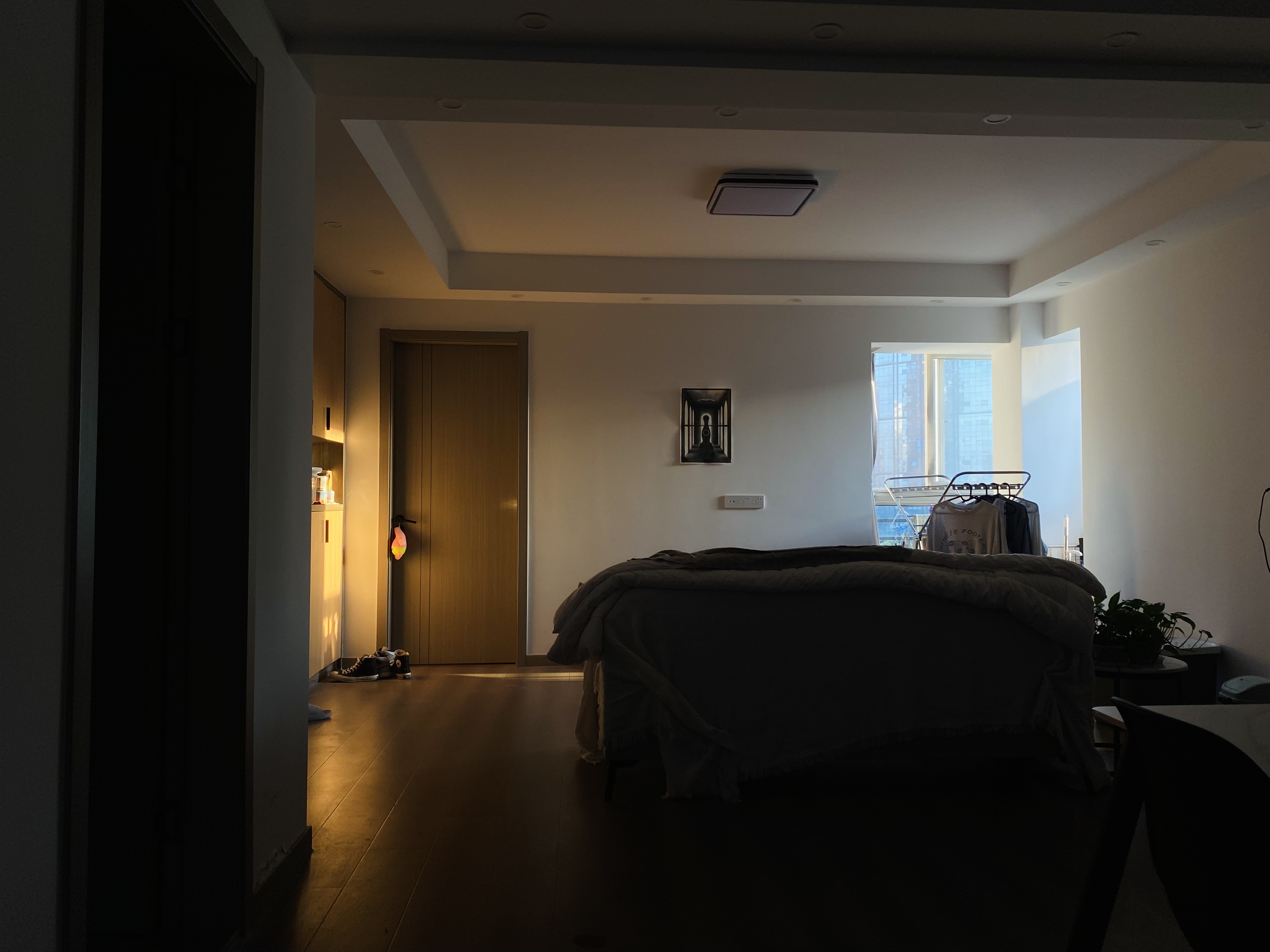 2023.4.2 打扫完屋子后照入黑暗客厅的黄色阳光及窗外的蓝色