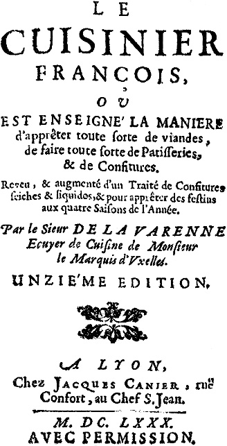 皮埃尔·弗朗索瓦·拉瓦雷恩(上书作者):(1615-1678年),出生于勃艮第。他是法国厨师团体中最重要的成员,为专业读者撰写文章,他们在路易十四国王时代编纂了法国美食。他可能在孩童时期就在亨利四世的厨房里开始烹饪。