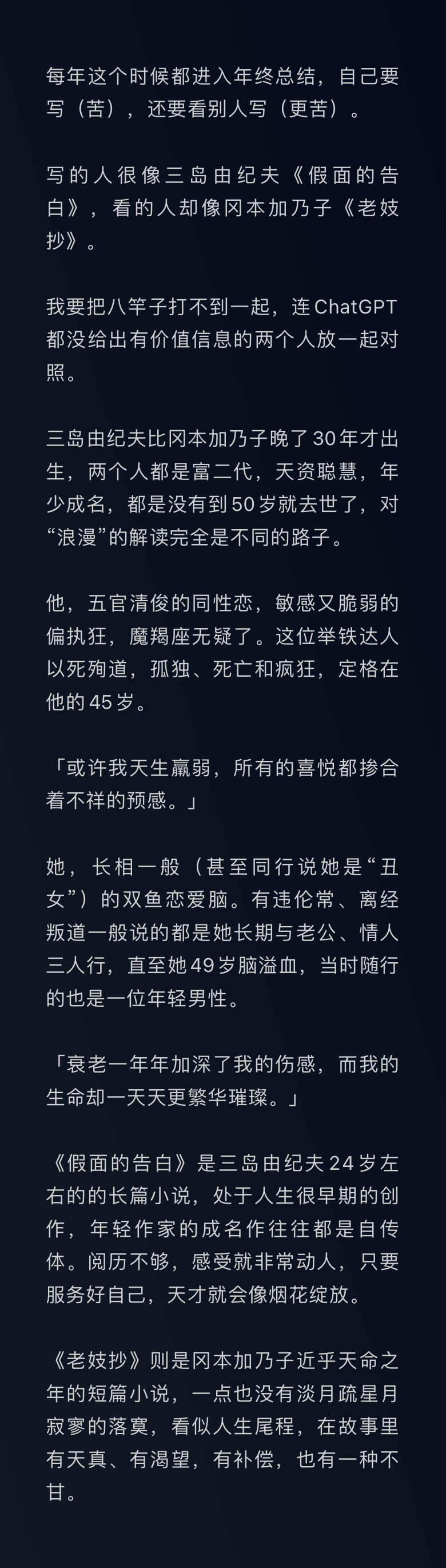 《假面的告白》是三岛由纪夫 24岁左右的的长篇小说,处于人生很早期的创作,年轻作家的成名作往往都是自传体。阅历不够,感受就非常动人,只要服务好自己,天才就会像烟花绽放。