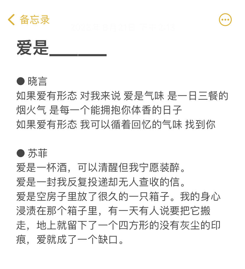 没想到,还真有!一周时间内,大家发来了朗读王小波,聂鲁达,余秀华作品的片段,以及许多关于自己爱情心路的分享,甚至是婚礼发言。三位作家也恰好代表了“久处不厌”“反复爱上”和“爱而不得”三种爱的状态。