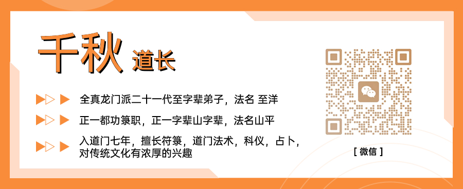 千秋道长,全真龙门派二十一代至字辈弟子,法名 至洋。 同时授正一都功箓职,正一字辈山字辈,法名山平。入道门六七年,同时也是中国智库考核认证的国学培训师。