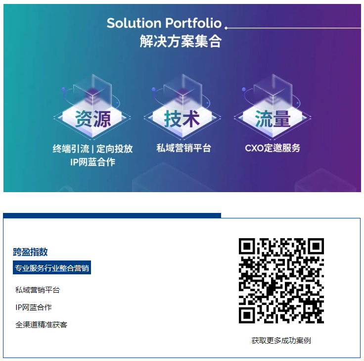 跨盈指数是一家领先的B2B专业服务行业营销服务机构,深耕于B2B专业服务行业,专注在营销科技,内容创新和平台建设,帮助企业的营销者实现市场驱动业务,以及解决职场大咖(网蓝)自身IP打造过程中营销难,背书难,落地难等问题。