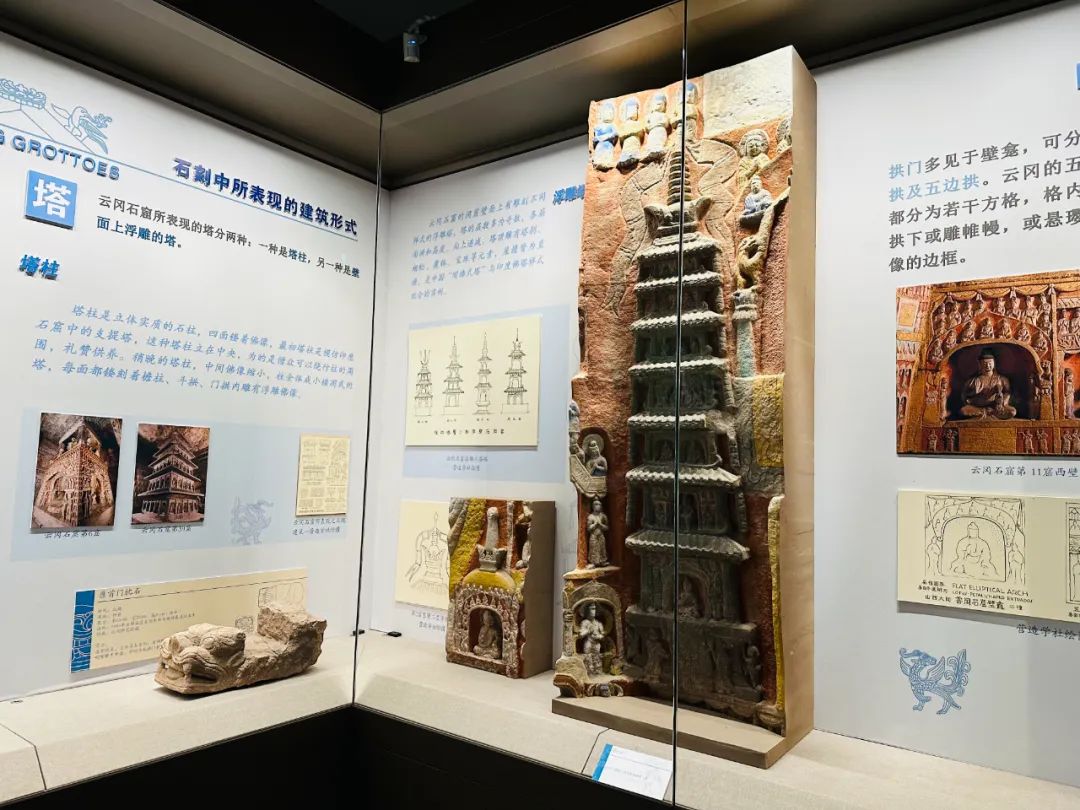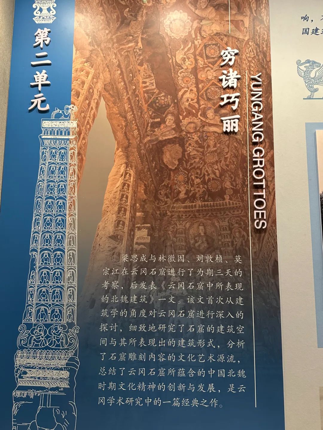 展览回顾了营造学社梁思成与林徽因、刘敦桢、莫宗江在云冈石窟进行了为期三天的考察,后发表《云冈石窟中所表现的北魏建筑》一文。该文首次从建筑学的角度对云冈石窟进行深入的探讨,细致地研究了石窟的建筑空间与其所表现出的建筑形式,分析了石窟雕刻内容的文化艺术源流,总结了云冈石窟其所代表的交流互鉴、开放包容、源远流长、博大精深的文化内涵。