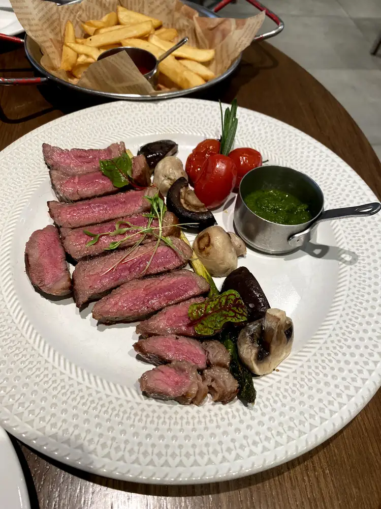 照片1:我们吃饭,吃的牛排、意面,喝的苹果汁和葡萄酒