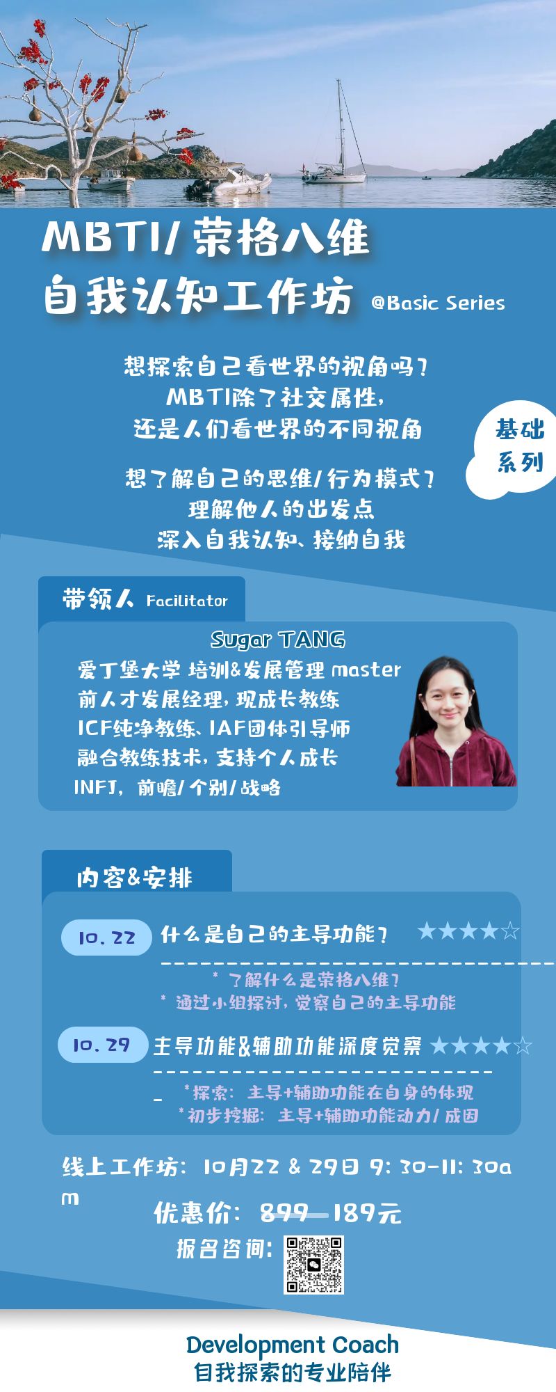 如果想进一步:了解MBTI/荣格八维,用于自我认知,欢迎报名:10月 【MBTI/荣格八维自我认知工作坊】