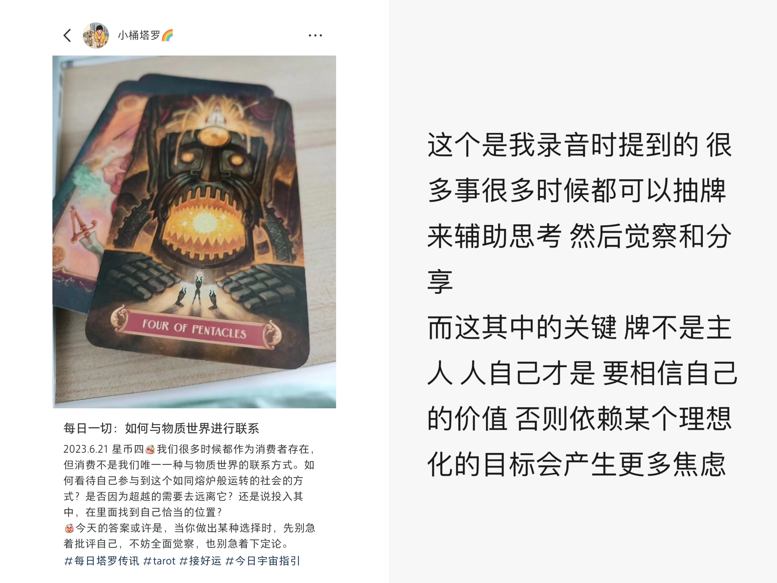 从质疑带着好奇到理解探究,主播胡晨韵也在节目中开启了自己的塔罗占卜,让塔罗牌展现了关于即将到来的出差之旅和未来自我发展的可能性。在此次关于“神秘力量”的探索旅途当中,也让我们对自己的未来有了更加多样的勇气与包容的心态。