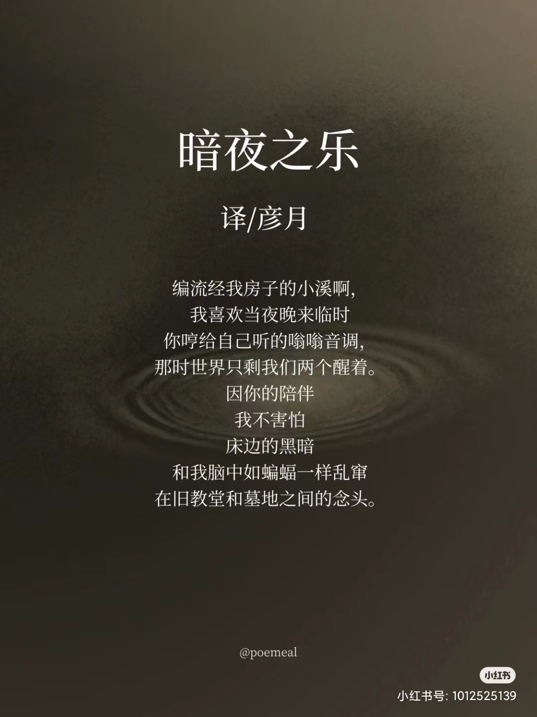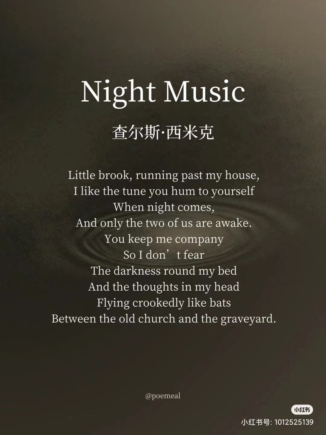 《疯子:西米克诗集》是2022年我最喜欢的诗集之一,他的诗歌有一种独特的气质:既幽默又伤感。许多诗人都会运用超现实的写法,通常意象繁复密集,西米克的却并不晦涩,如电影场景般可被感知,我们好像能看见,一位孤独的诗人正与夜晚、马、溪水、光甚至跳蚤等一切事物对话。“维纳斯和蟑螂一起洗澡”,对他而言,没有什么既定的规则和标准,所有的事物、形色各异的生灵都有自己的视角,事物存在本身以及他们视角的转换都是诗意。他不是“疯子”,他的诗歌中却有疯子般的纯真。试译的这首《暗夜之乐》,是“我”与“溪水”的对话。溪水只是哼唱给自己听的歌,却温暖了一位在深夜中失眠的诗人。正如看着这首诗的我们,下课或是下班回家,一身疲惫躺在床上却无法入眠,而诗人写下的诗句,穿过了时间和空间,在四周静默的黑暗中,奏响了一首暗夜之乐……那音乐对我们说:“别害怕”。