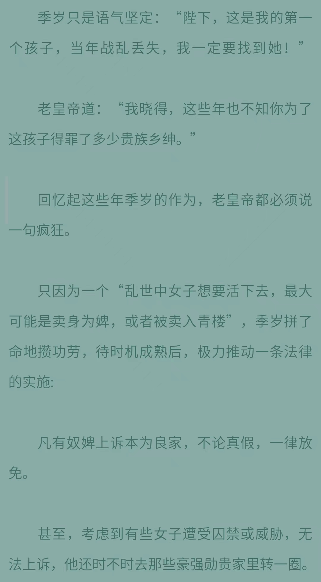 季安他为了保护自己可能流落在外的女儿(实际是孙女),坚持多年救助青楼女子,解放青楼给女性找到生机,解放卖身女奴,为此不惜和很多豪强对着干,但他几十年就这么日复一日的坚持下来了。
