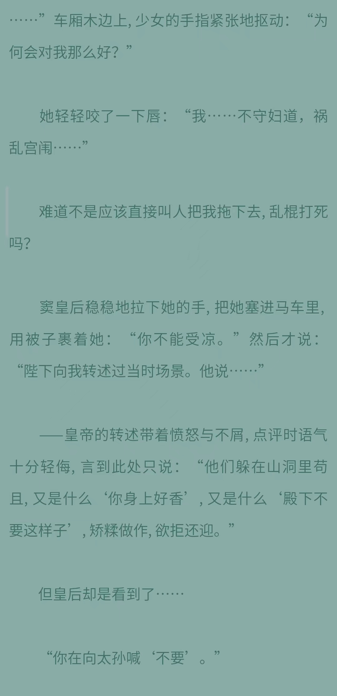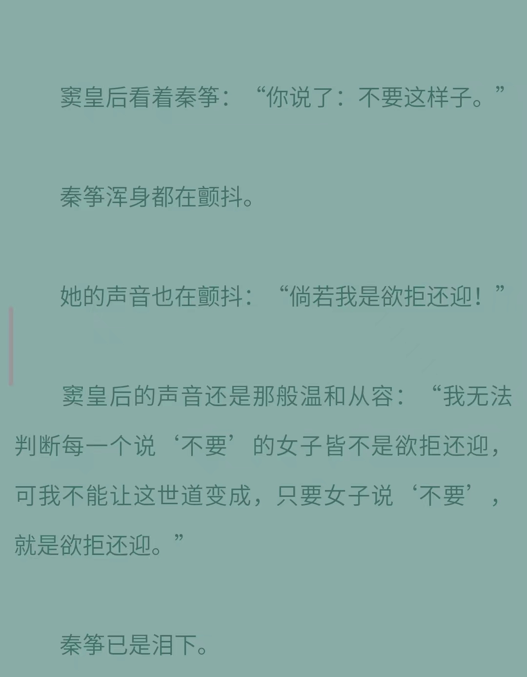而其中很喜欢的就是皇后,她真的兼具胆魄和柔肠,从崇尚女德的皇上手下救出无辜女性。甚至说出“我无法判断每一个说“不要”的女子皆不是欲拒还迎,可我不能让这世道变成,只要女子说“不要”,就是欲拒还迎。”