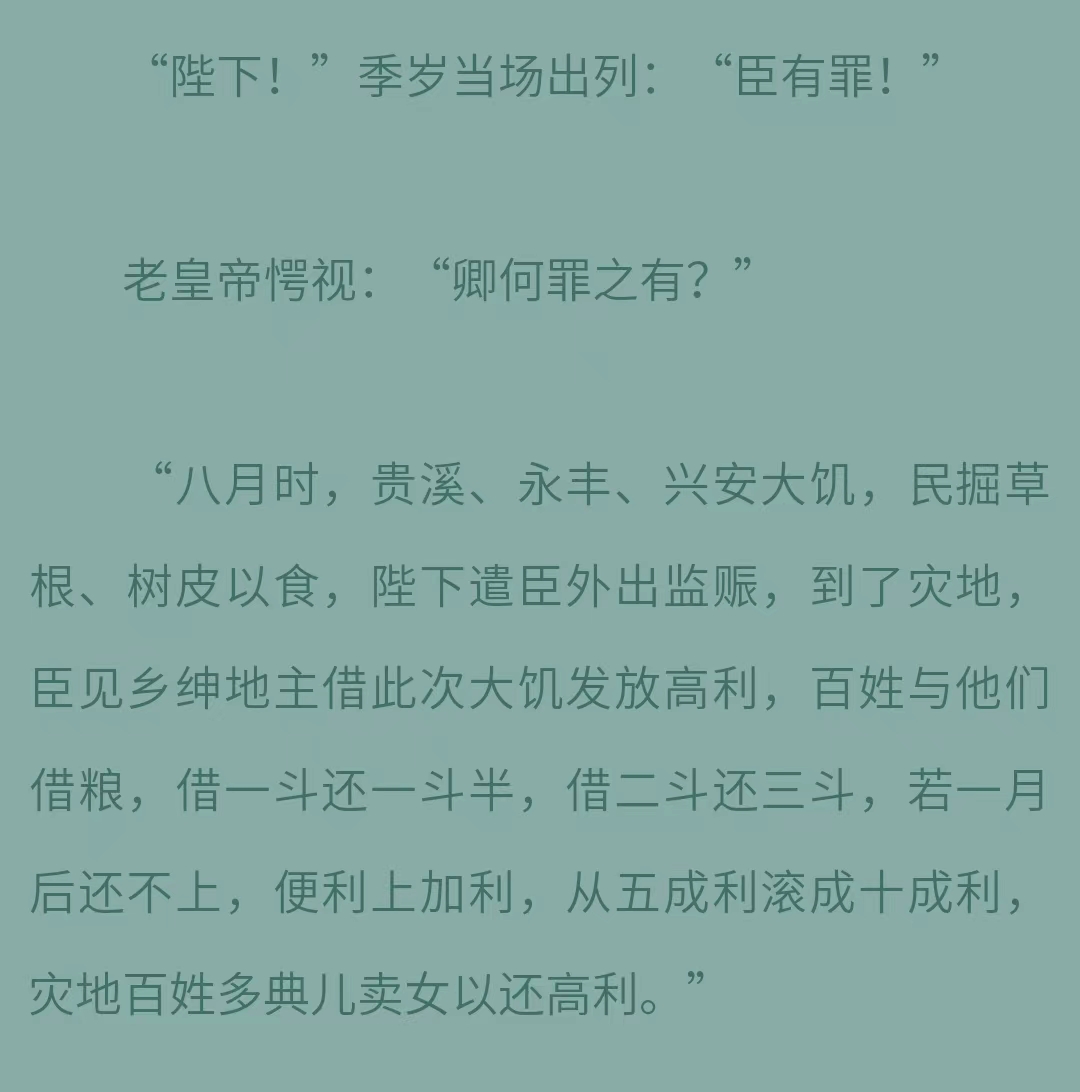 故事里的季安第一次出场就是处理了地方大饥荒,严惩了收高利贷的豪强,随机应变假传圣旨以开粮仓救百姓,得到了皇帝赞许。要做的第一件事,就是把因为女人而被皇帝罚进监狱的皇太孙捞出来。