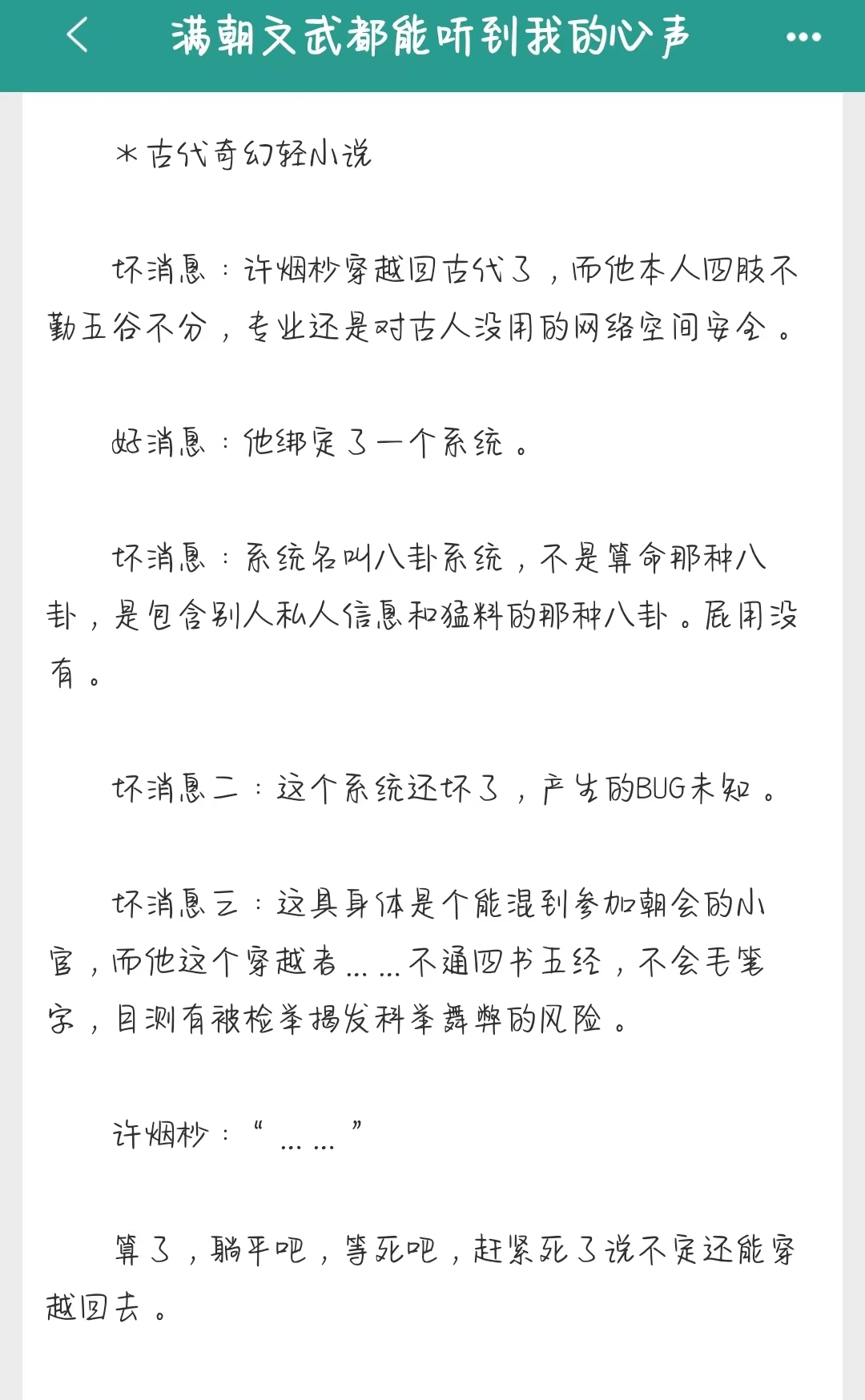 这本是一本沙雕吃瓜文,按照作者自己的说法,这是一篇古代奇幻轻小说,但这名字和文案也太奇幻了点,帅比很早之前就知道这本书,但一直都被这本书的沙雕文案和脑洞震撼劝退,一直没点开看,现在看了之后才逐渐从沙雕乃至有些无理由的故事情节中get到一些很喜欢的点,所以来和大家分享下~