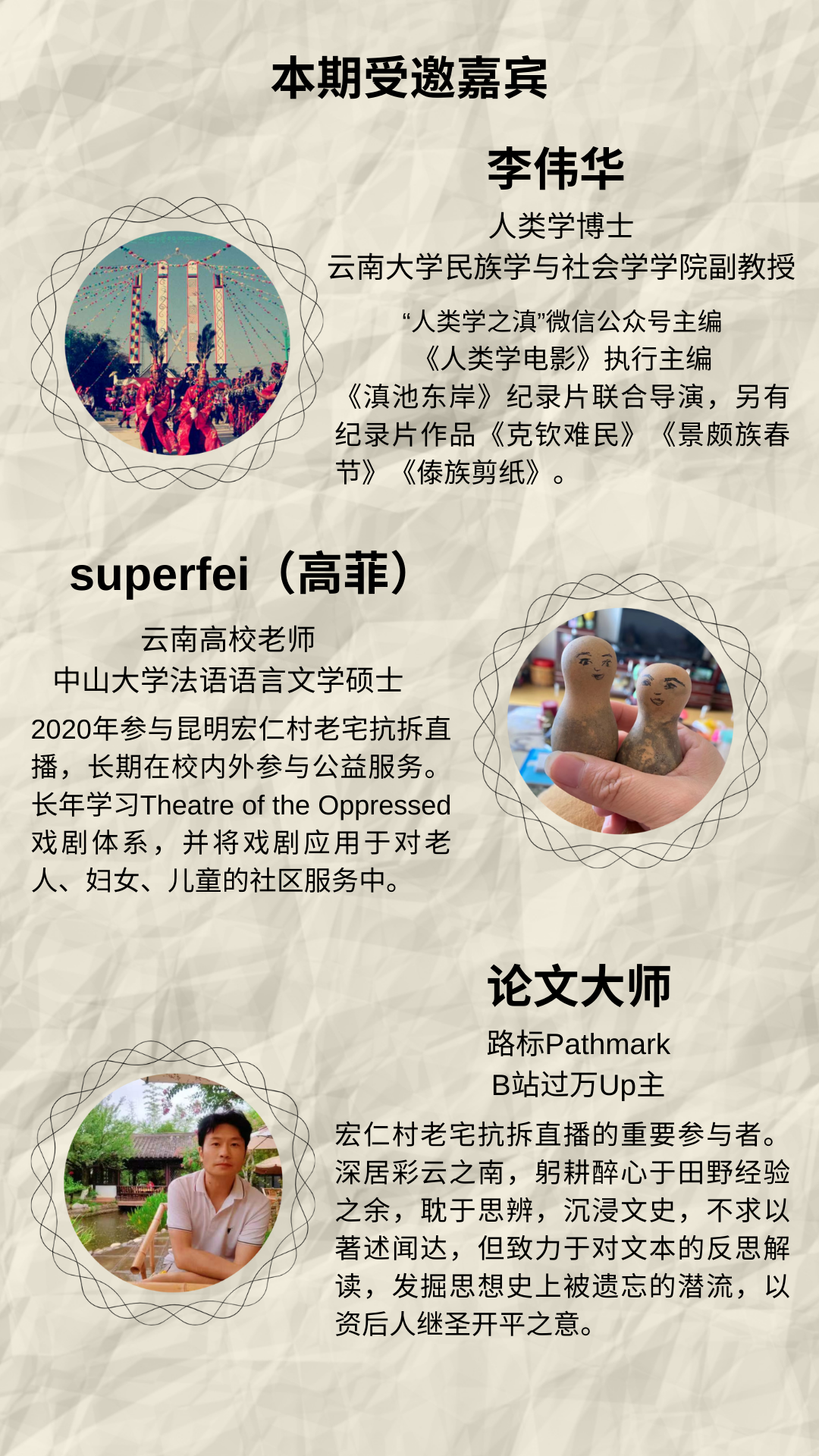 本期Podcast很荣幸邀请到《百年老宅十年抗拆记》昆明宏仁村老宅抗拆直播的发起者superfei、云南大学民族学与社会学学院李伟华副教授及宏仁村直播守护活动的重要参与者五华山论文大师,和大家一起聊聊如何保护古村落和古建筑,以及城市发展进程中,文物保护之困。