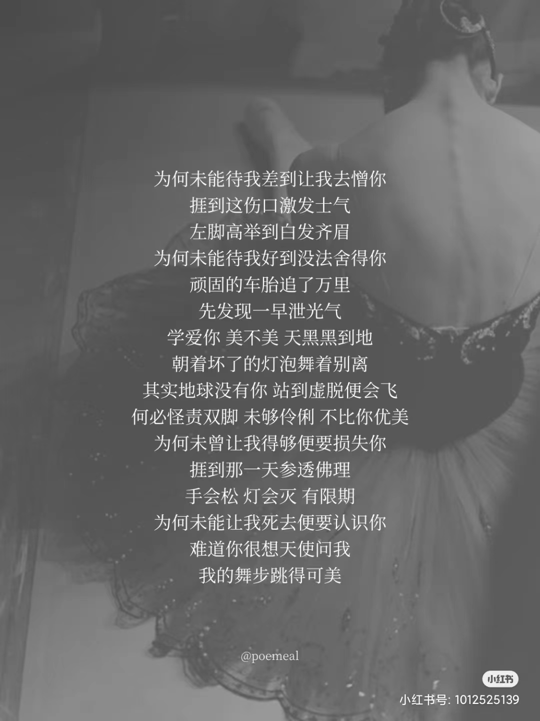 “左脚高举到白发齐眉”,乃彻底的悲哀,哀其往昔之不再,愿景之无存。其一个人,独而不立,沦丧了全然的自己,却仍想着幻想过的圆满,终而再度破碎了镜中的自己。就算“捱到那一天参透佛理”,又岂会抛却我执?正如林夕学了佛,却也无法从情感中解脱。佛理难敌感性,反而放大了不能割舍的悲哀。“夫哀莫大于心死,而人死亦次之。”心死,便独舞终生以待你;人死,便才能结束这卑微的一生。但真能了结吗?“我的舞步跳得可美?”