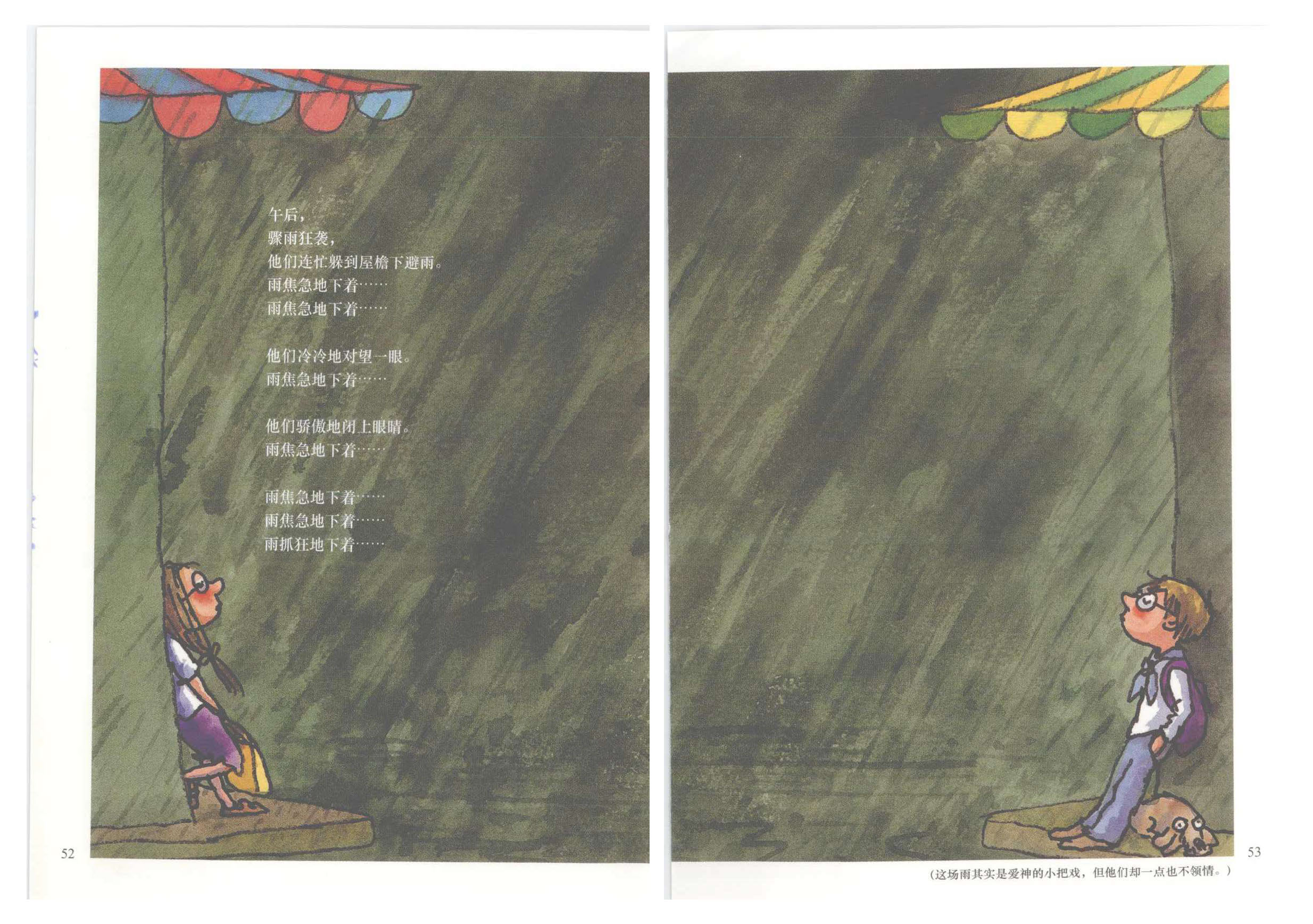 他们连忙躲到屋檐下避雨。
