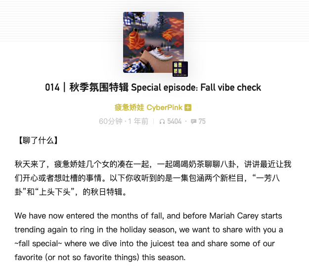 这期节目我们来尝试做了一次秋日的vibe check,第一次做这个类型的节目,算是一种心愿的实现。我们两个都算是非常有情怀和念旧的人,对于小时候的美好事物,秋游和很多仪式感的事情都会让我感到心中涌起的雀跃。我们从秋天的关键词“桂花”“柿子”“秋游”聊起,分享了最近进入了秋天之后生活里发生的一些有趣的事情,让我们意识到还拥有这种对于生活中小细节的感知能力是一件很幸福的事情。就像西西说的:在这样四季变换的时刻,能隔着距离和屏幕光靠着我们的叙事就能调动大家的其他感官,让我们在时间里相遇,是一件还蛮有仪式感和意义的事情。