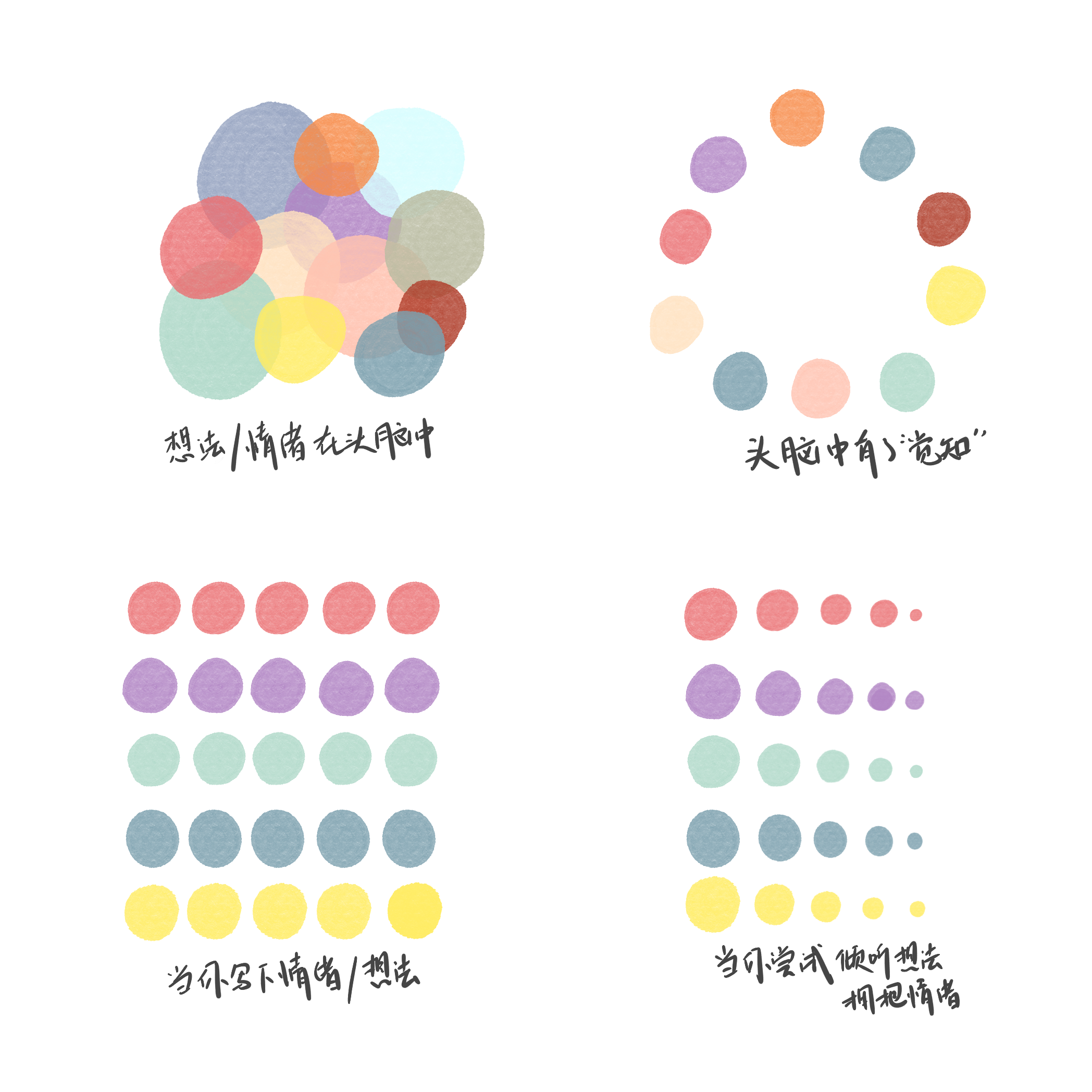 这个练习是我在积极心理学的课程上了解的辅助练习,可以帮助我们退一步,站在头脑之外,去跟脑海里的思绪和情绪做一个梳理。要知道,一旦完成了情绪和思维的识别,它们就会开始消解,下面我画的这个图很清楚的呈现了:愿我们被慈心围绕,欢迎交流练习感受,所有的练习要坚持才有用哦~