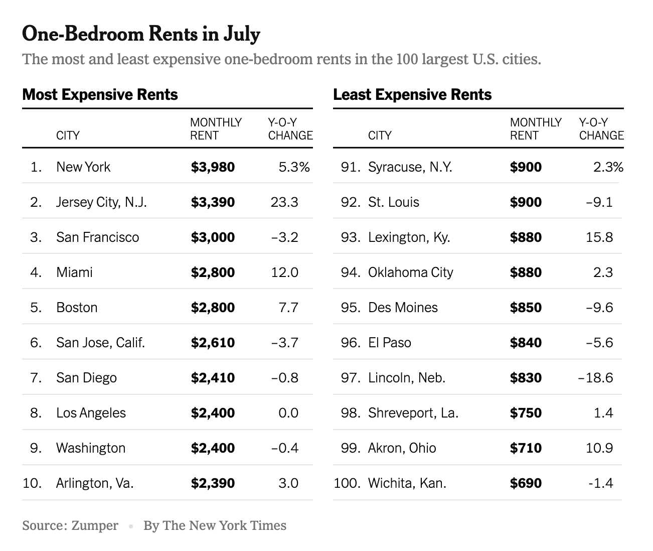 "New York had the distinction of having the highest median one-bedroom rent in the country ($3,980), up 5.3 percent since last year. But increases were far greater in other areas. Jersey City, N.J., the second most expensive city, had a median rent of $3,390, up 23.3 percent over a year. Durham, N.C., saw a 23.6 percent spike, to $1,570, while Miami, with the fourth most expensive one-bedrooms at $2,800, was up 12 percent."