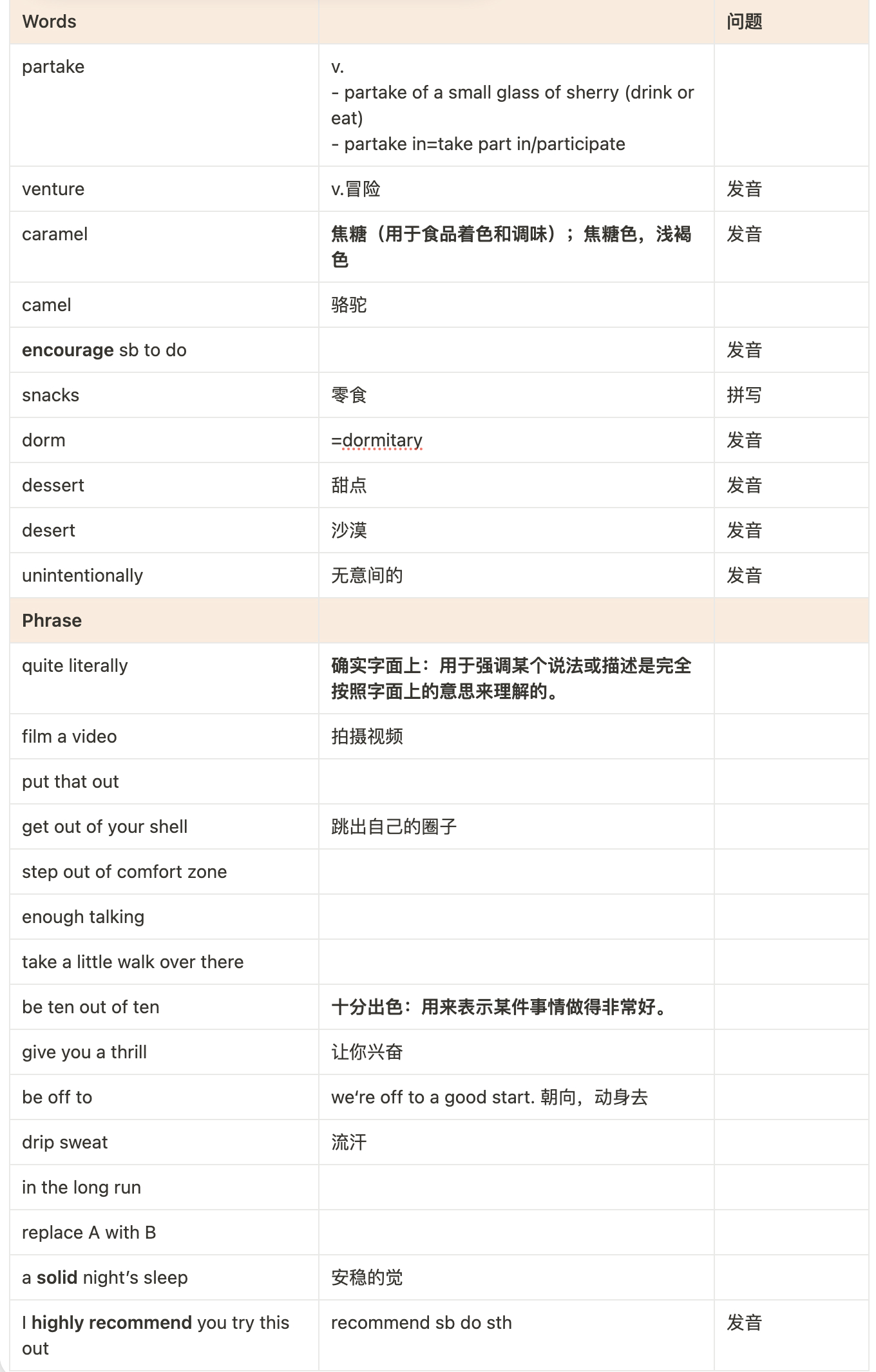 希望大家每天也可以做些新的小事情,让原本枯燥的生活生出点乐趣,说不定你在这个过程中也会得到新的机遇❤️,以下是我在第一遍听力过程中,听不到的生词和一些搭配短语供分享