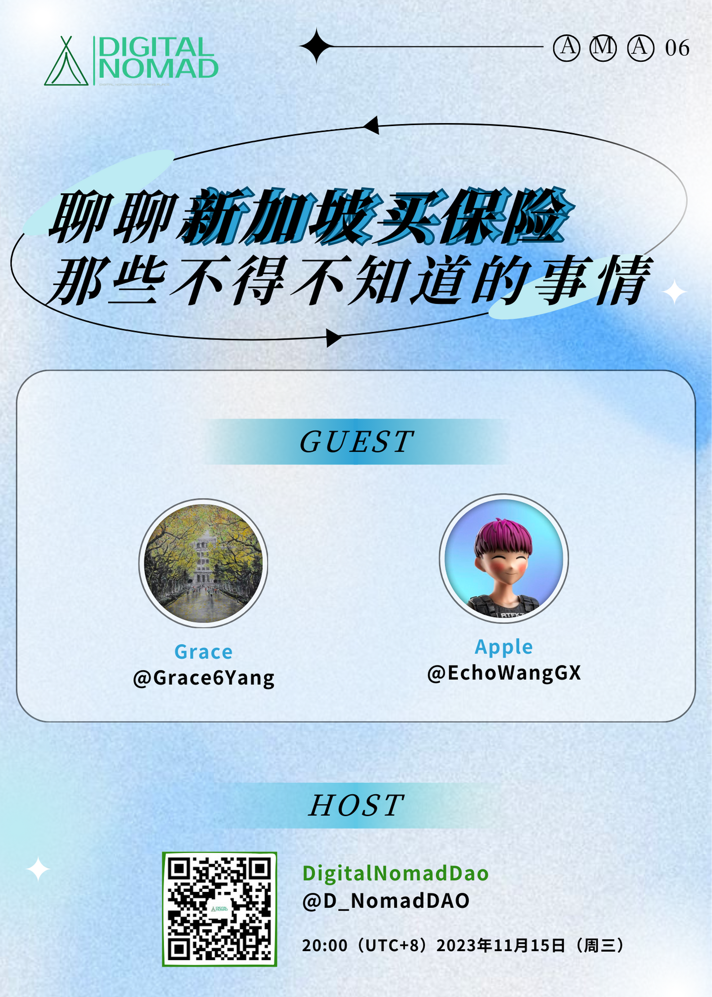 今天请到的两位新朋友,一位是Grace,在新加坡多年的保险从业者,资深理财顾问。另外一位是apple,在Web2 到 Web3 有丰富的工作经验,之前也在新加坡工作生活过,所以对这方面的信息非常了解。