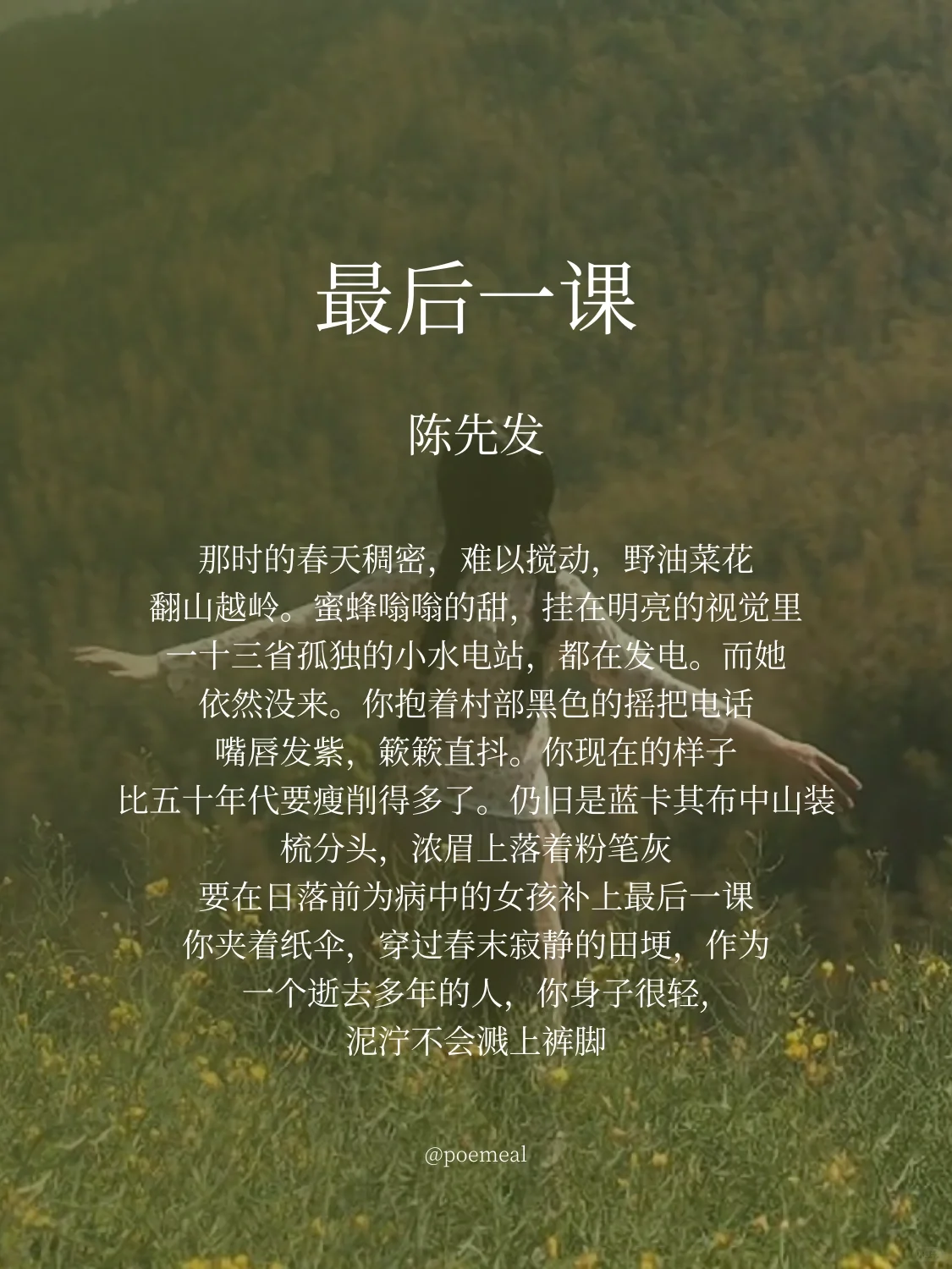 关键的一点在于诗歌中重与轻的平衡。虽然密集的意象,大量通感修辞,以及日落前/病中的/最后一课这样的组合,会使诗歌语言趋于具体和凝重,但放眼全诗,全景和特写的交错使用,抒情主体反常的沉默,结尾对于“逝去多年”的交代又造成架空效果,抵消了意象带来的沉重感,暗示读者工笔之外有着更多空白。