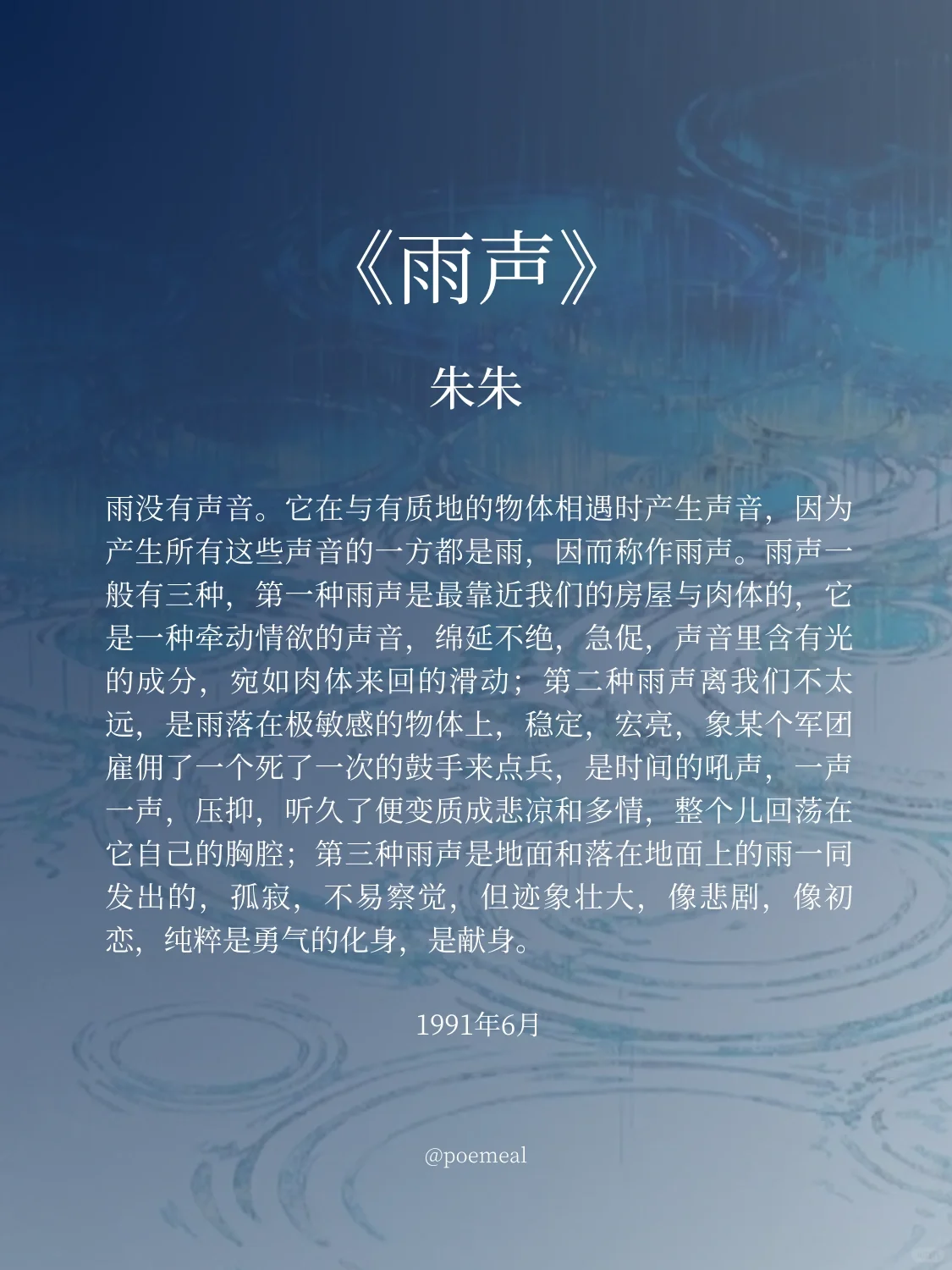 悬空的雨既没有形状也没有声音,只有当下落的雨与其他物质碰撞才有了声响、光芒、形体与情感。因而诗人从内心感知出发,将雨声分为三种:情欲的雨声、时间的雨声和大地的雨声。第一种雨声是雨与肉体的结合,房屋在朱朱笔下常常作为身体空间化的表达,当雨下落到屋顶时便牵引着身体中的情欲感官,因此它“绵延不绝,急促,声音里含有光的成分,宛如肉体来回的滑动”。第二种雨声是雨与万物结合,雨点敲打着极敏感的物体,因而万物发出了自己的声音,稳定,宏亮,是死者在生者身上舞蹈与歌唱,它“是时间的吼声,一声一声,压抑,听久了便变质成悲凉和多情,整个儿回荡在它自己的胸腔”。第三种雨声是雨与大地的结合,如一场大地的祭祀,仿佛历史发出呜鸣之声,所以它“孤寂,不易察觉,但迹象壮大,像悲剧,像初恋,纯粹是勇气的化身,是献身”。相比于传统古诗《虞美人·听雨》中蒋捷刻画了少年、壮年与晚年听雨的三种人生状态,朱朱的《雨声》取消了雨的客观性、现实感与历时性,使之具有物质性、精神性与抽象感,体现出现代人对情欲、时间与生命的本体论哲思。于是我们看到诗人是如何脱下雨的“物质化的外壳”,悬置了自然主义态度,从自我意识出发对词与物进行还原,“雨”作为一种物质以更为本真的状态敞开了自身,“雨”作为一个词语被重新创造了出来,彰显着自我、语言与世界的关联。