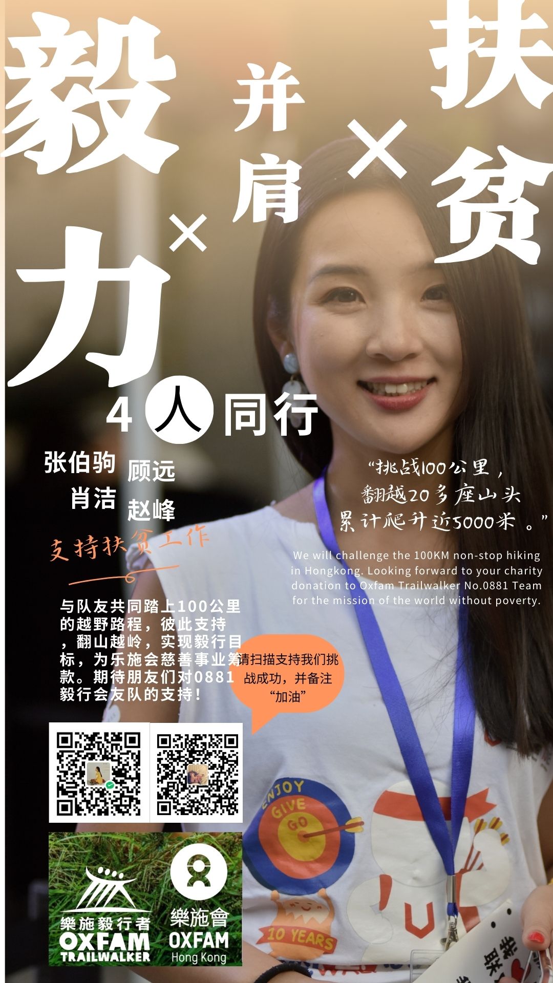参与者需要4人一队,日夜兼程、共同完成整整100公里、翻越20多个山头、累计攀升近5000米高度的越野行走或越野跑,并在所有10个检查站和终点同时到达。活动的目的是为公益组织乐施会的全球扶贫公益项目进行倡议和筹款。欢迎大家通过乐施毅行者的网站了解更多。