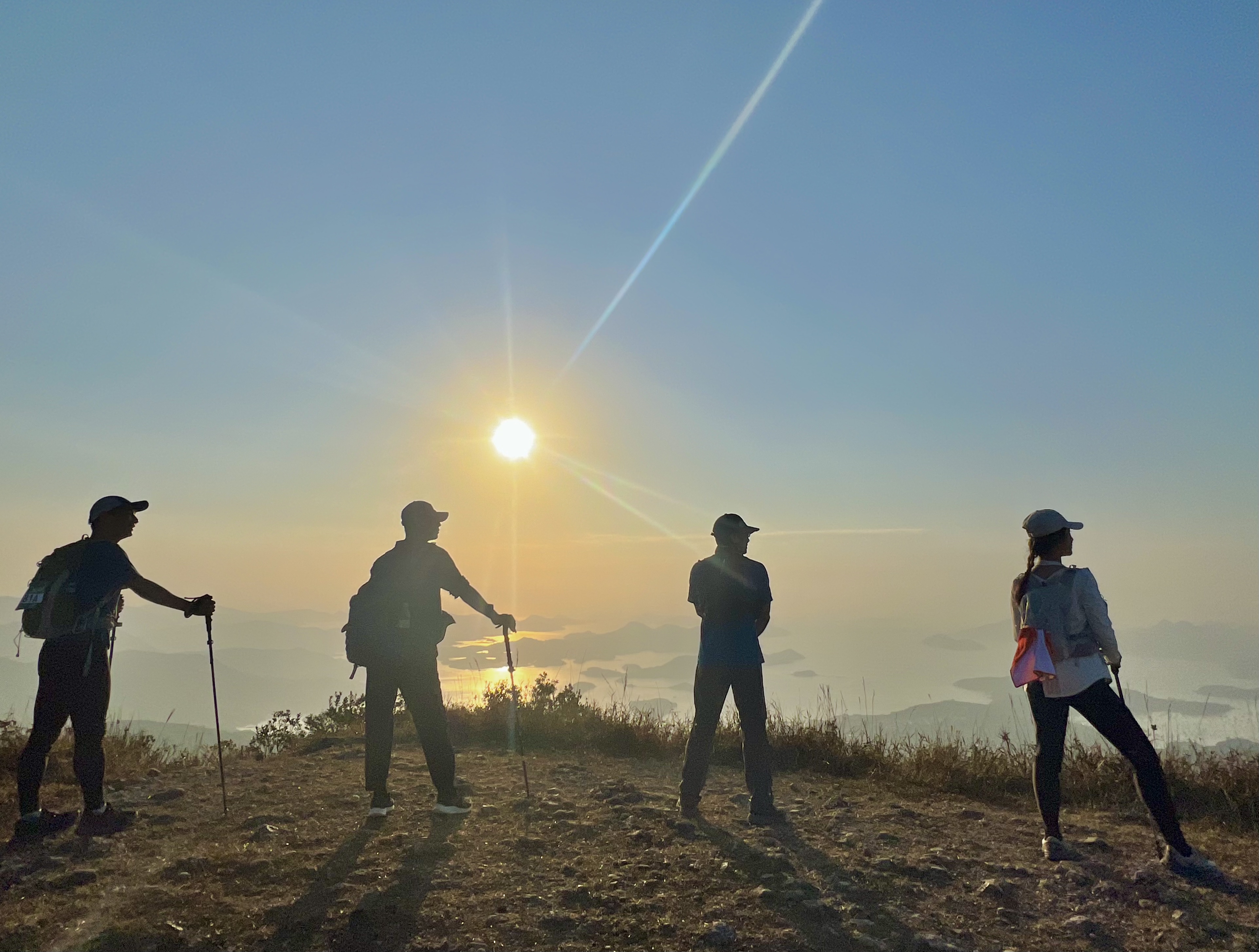 【差不多走了20小时后,在马鞍山的朝阳下的四人合影。四年前这里有过一张一模一样的照片】