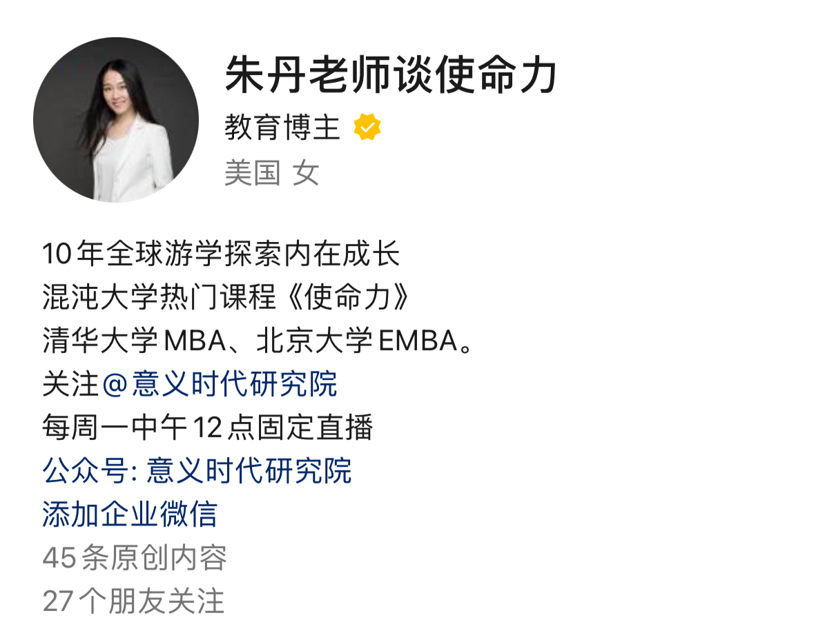 朱丹老师是混沌大学热门课程《使命力》的主讲人,也是一位致力于分享女性自我成长的讲师,大家如果对这个方面感兴趣,可以通过视频号「朱丹老师谈使命力」来关注到她。