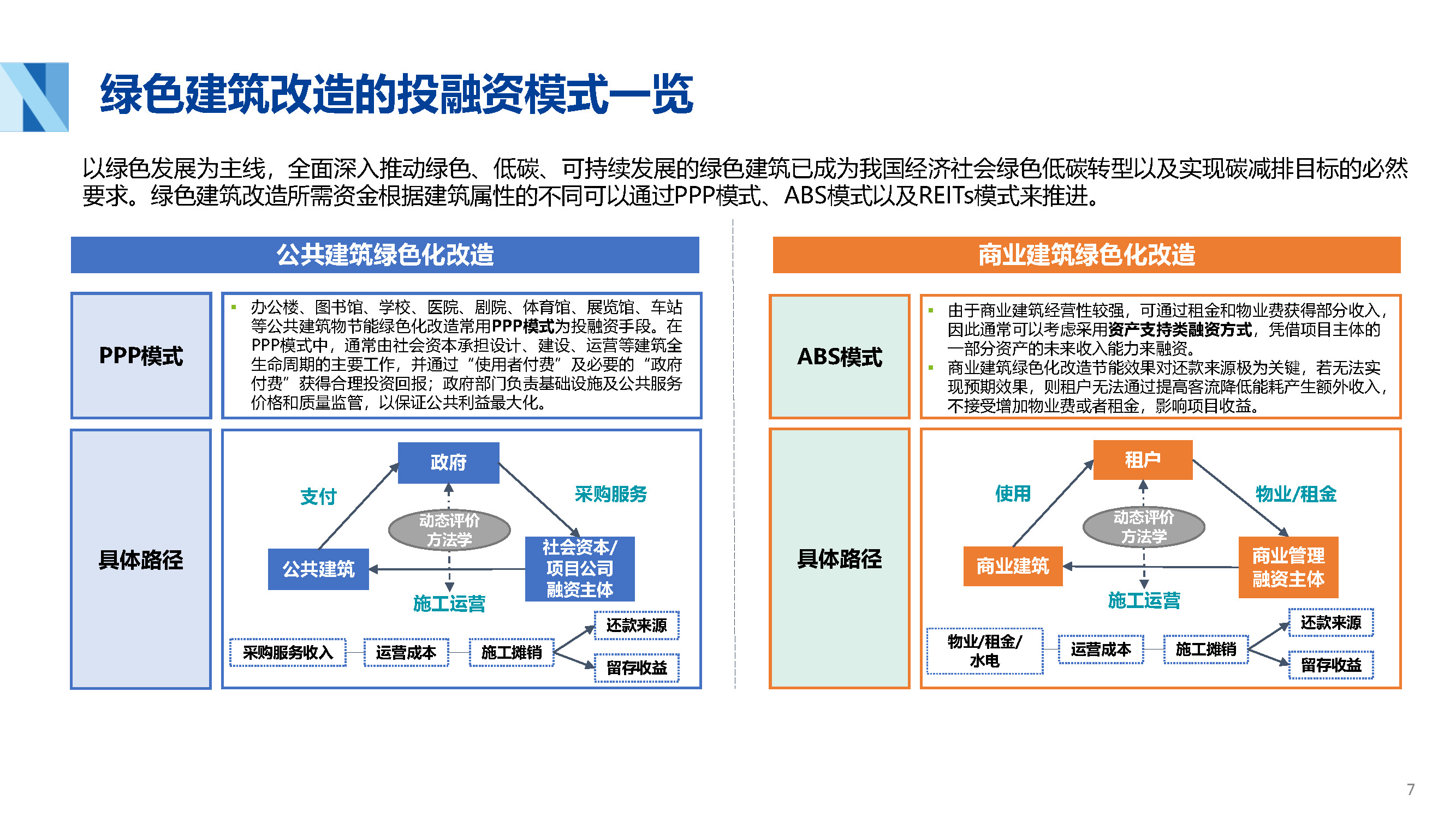 绿色建筑改造投融资的三种主流模式:PPP模式,ABS模式以及REITs模式以及各自适用的建筑类型。