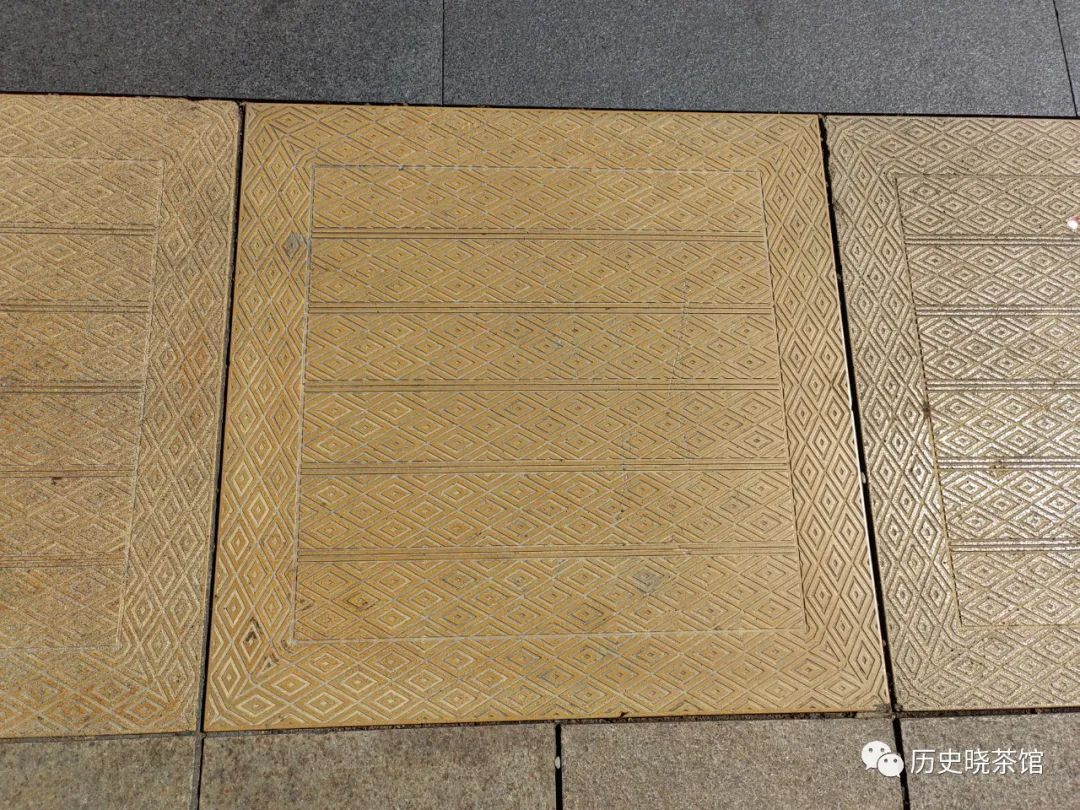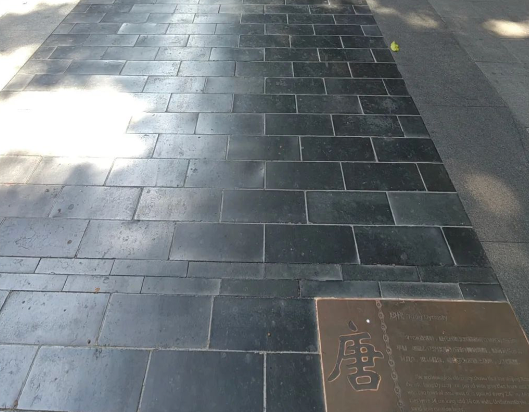 走过大唐,本该是三国两晋南北朝,但可能是考古发掘没有揭示这一时期路面,我们直接来到了两千多年前的西汉南越国时期。其实,这段西汉南越国时期的路面,仿造的是南越国宫署的走道,中间平铺两行素面砂岩石板,两侧砌70*70厘米印花砖夹边。
