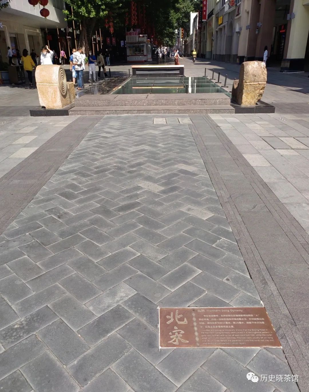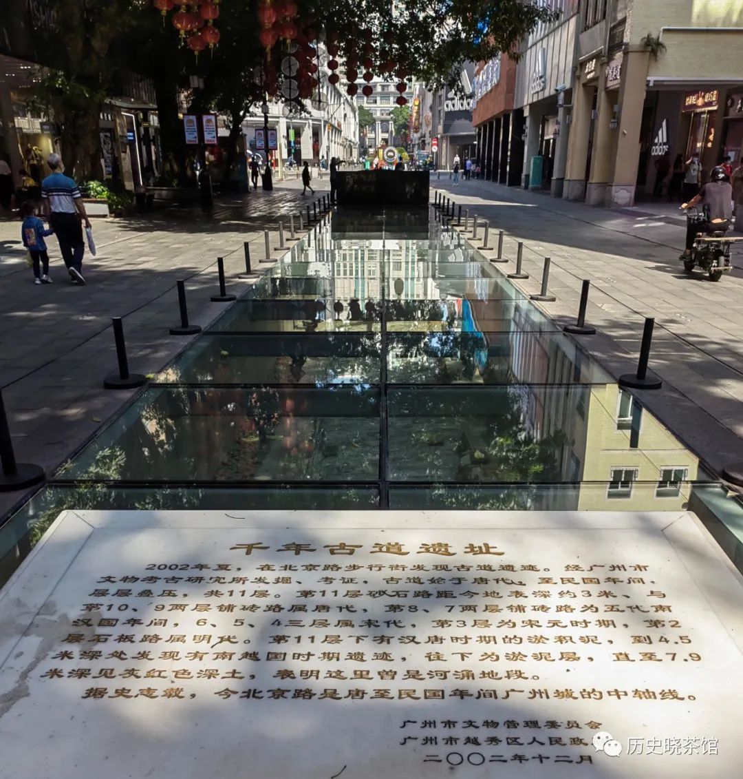 南越路面的尽头,你会看到真正的古代路面。当然,是在地下。上面有“千年古道遗址”石牌。透过玻璃罩,可以看到北宋、宋元、明代时期的路面,随着年代的久远逐渐下沉。我们也从上至下,看看不同时期的北京路的真实路面。