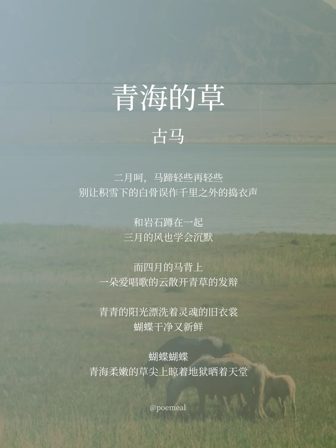 《青海的草》是古马的一首名作,写于一九九八年,先后收录于《扎尕那草图》《飞行的湖》《古马的诗》等诗歌集,后不断入选各种诗歌选本。这是一首抒情诗: