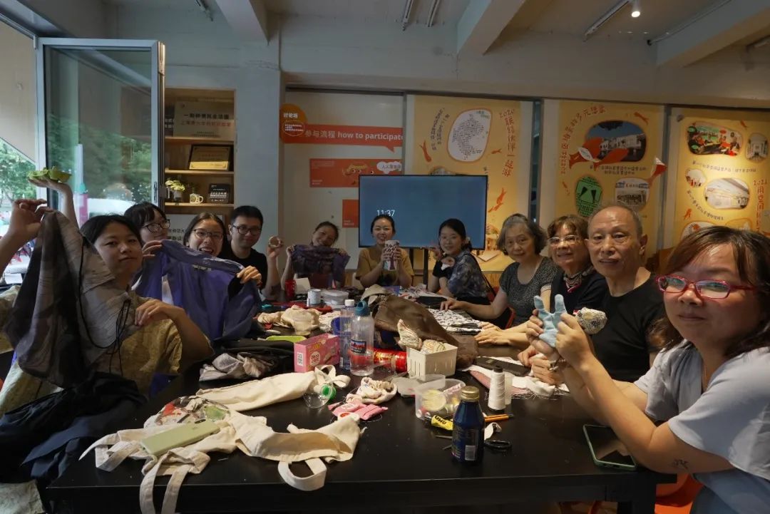 第一次预热且较为随性的链接是编织、缝补等手工技能的交换。在前期调研采访中发现,很多长辈拥有很多技能,像种花种菜、缝纫、编织,或许这些正是年轻人想做但又不太擅长的事。在工作坊现场有伙伴抛出缝纫礼仪的议题后,实操环节就开始了。面对大家带来的旧物,参与者们迅速自动组队,并沉浸在思考、设计、改造、动手、讨论、请教的事项里,让承载生活和记忆老物件焕发新生。