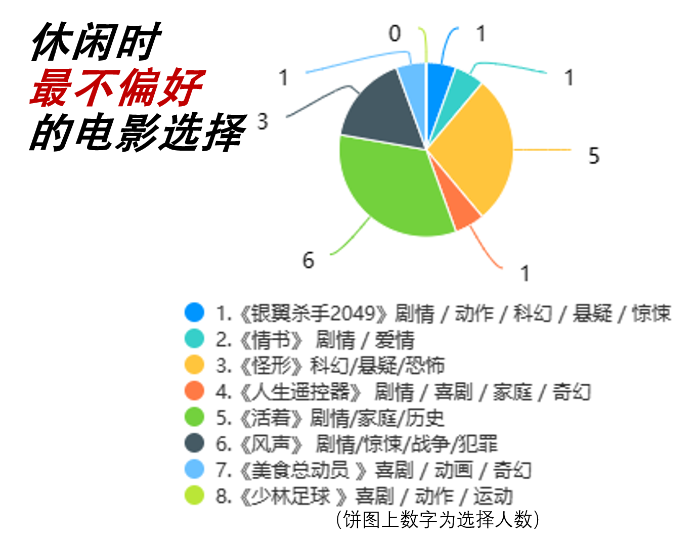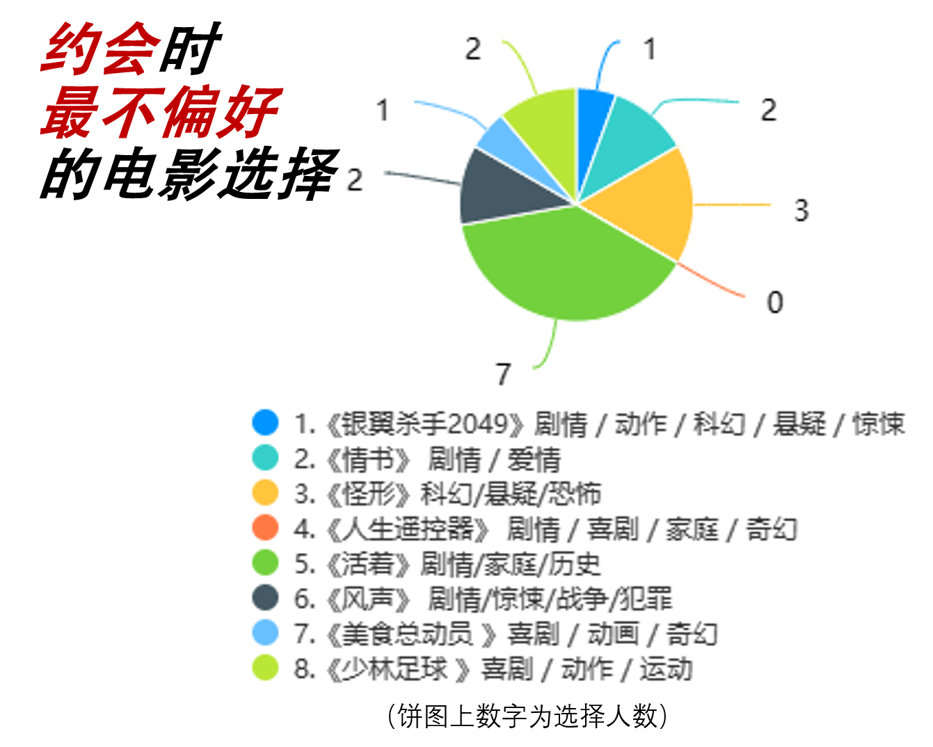 39:38 问卷内容:从《银翼杀手2049》、《情书》、《怪形》、《人生遥控器》、《活着》、《风声》、《美食总动员》、《少林足球 》这八部电影中选出了自己在休闲时和与有好感对象约会时最想看和最不想看的电影。