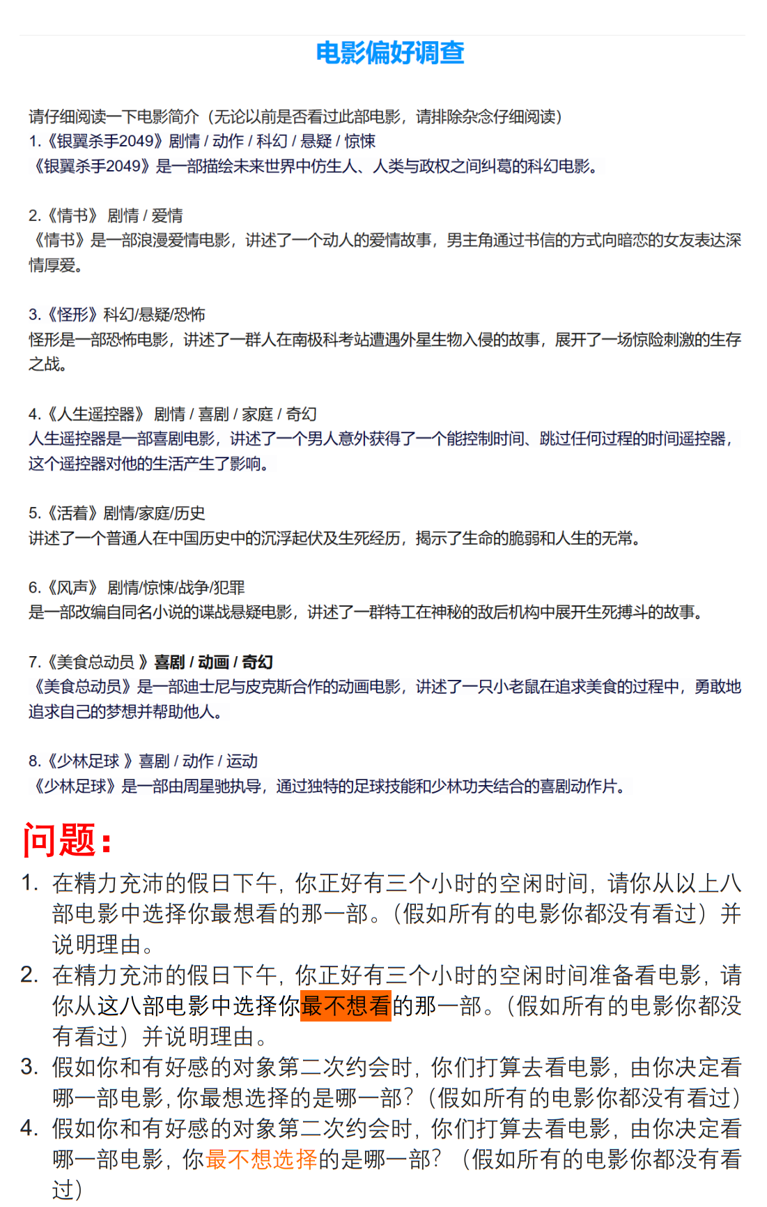 这是我们的问卷链接,也欢迎感兴趣的听友填写。电影偏好调查 (wjx.cn)
