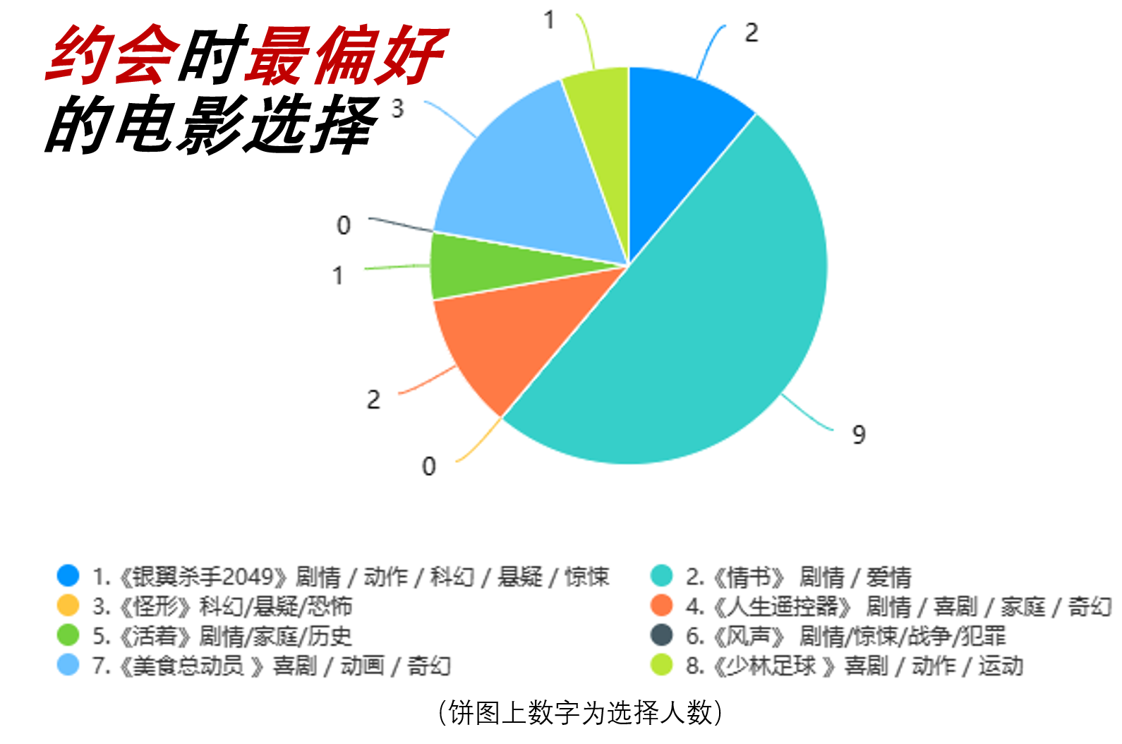 本期节目我们做了一个有意思的小调查,对九位男生和九位女生进行了关于观影偏好的非随机调查。这18位出生于1995年至2000年的年轻人回答了图一中的问题,从《银翼杀手2049》、《情书》、《怪形》、《人生遥控器》、《活着》、《风声》、《美食总动员》、《少林足球 》这八部电影中选出了自己在休闲时和与有好感对象约会时最想看和最不想看的电影。令人惊奇的是,在18位青年人中仅有5位自己休闲时与约会时的观影偏好一致,而其余13位的偏好都有改变。播客《洗碗时间到》中讨论了此次调研的详细结果和大家选择的理由。