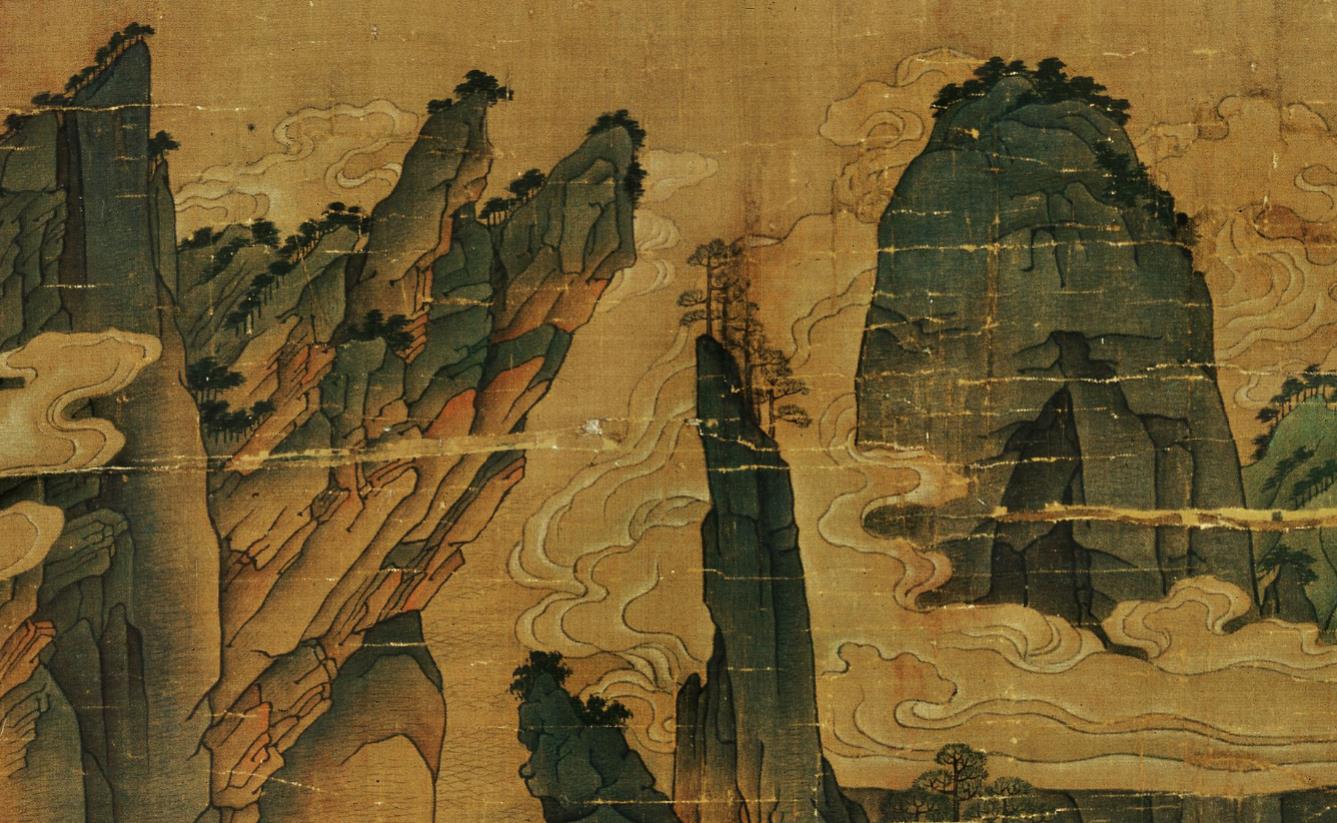 这幅画的构图呈现了一种新的形势,大面积的画山石,山头小面积的留白,给人造成一种压迫感,来体现山石的雄伟,后世很多表现大山的作品都利用了这种形式,比如范宽的《溪山行旅图》、沈周的《庐山高》都是这路画风。还有一点要强调的,这里同时出现了高远和深远的视角,从山脚到山头就是高远;右侧画面出现一个大豁口,透过这里可以看到层层远山,这就是深远。只不过这些理论还没有总结出来,李昭道这里已经在绘画实践中开始应用了。