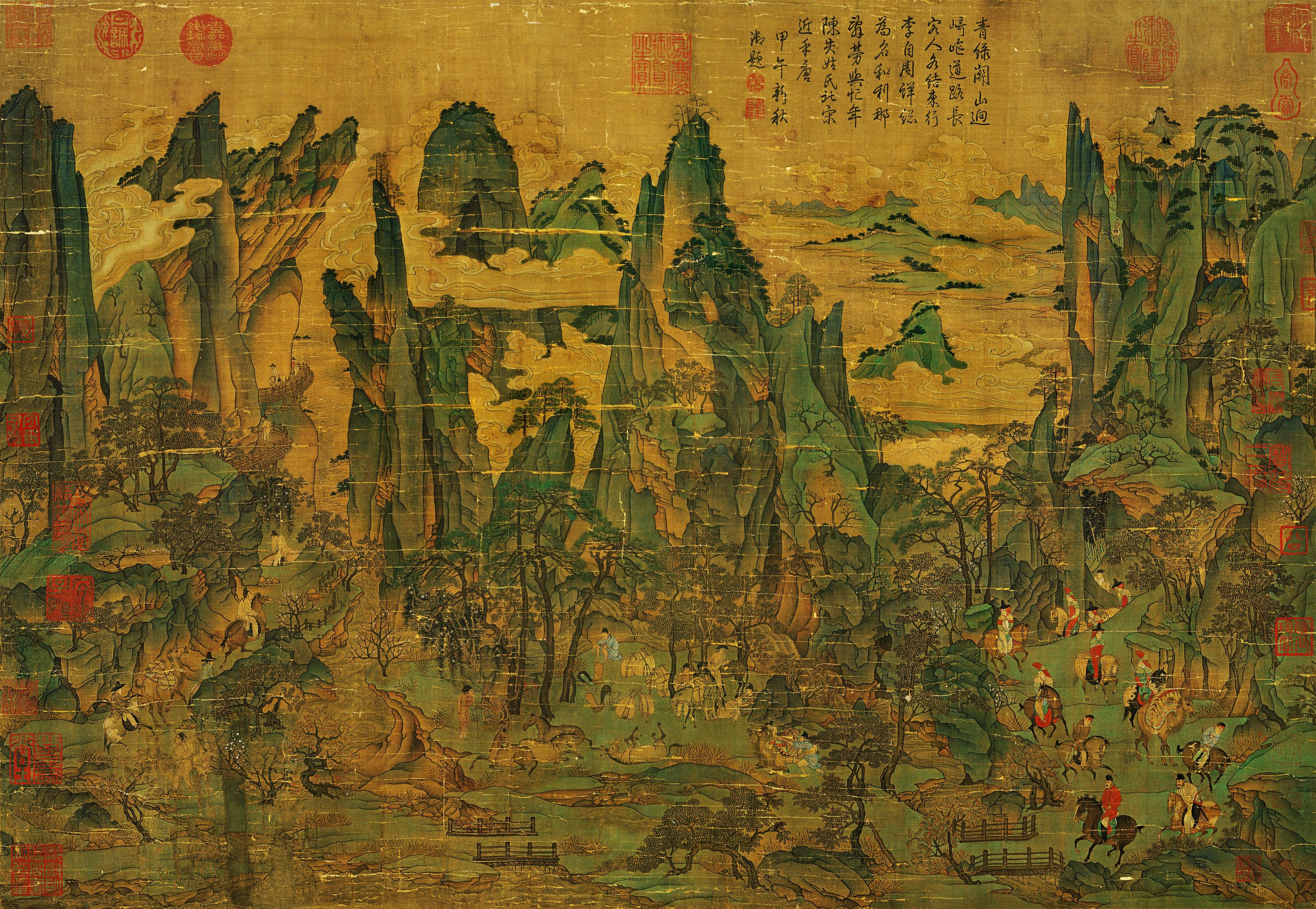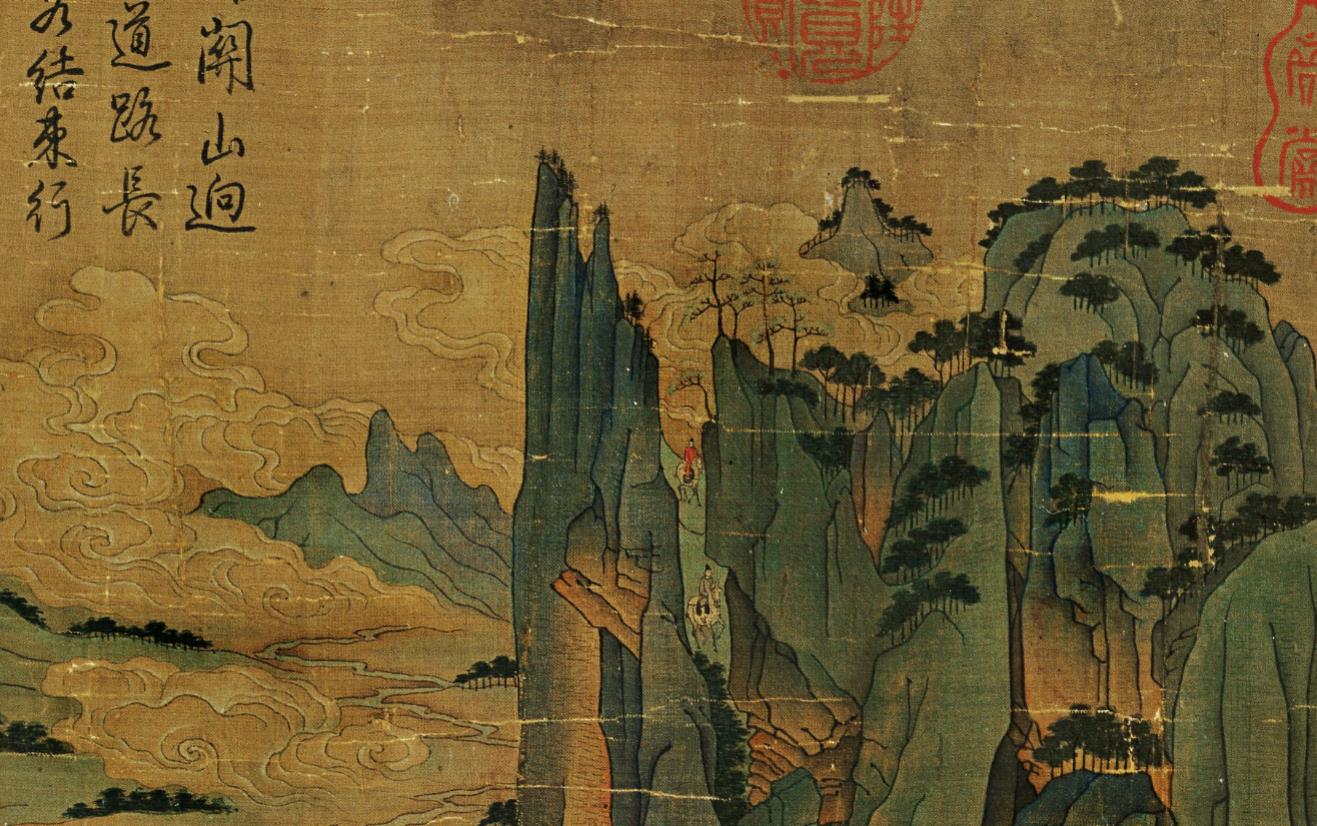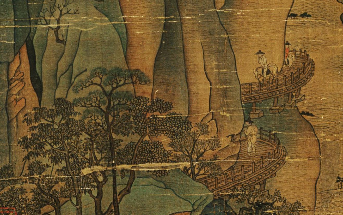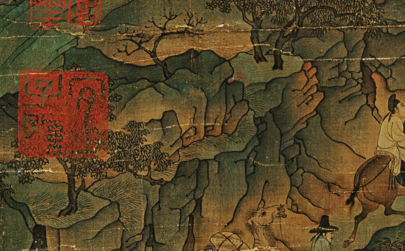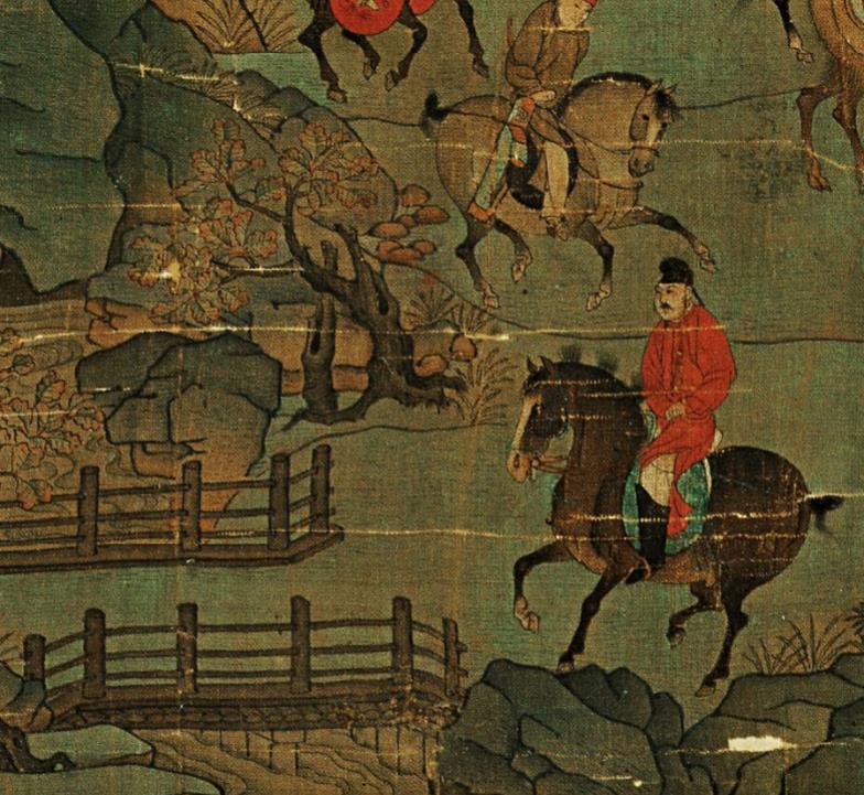 在右下侧,据说画面穿红衣正要骑马过桥的人就是李隆基,他的殡妃、随从压缩在画幅的右下角,我们沿着路向后看,在极高处的山头还有两个骑马的人在山间赶路,可见来路之辛苦。过了前面的空场和小桥,前方的道路向左上方延伸出去,直到远处危耸的栈道消失于绝壑之中,前方的路也将是险象环生。画面中间这块地方是难得的空场,是这一路艰险的道路上可以松口气的地方。