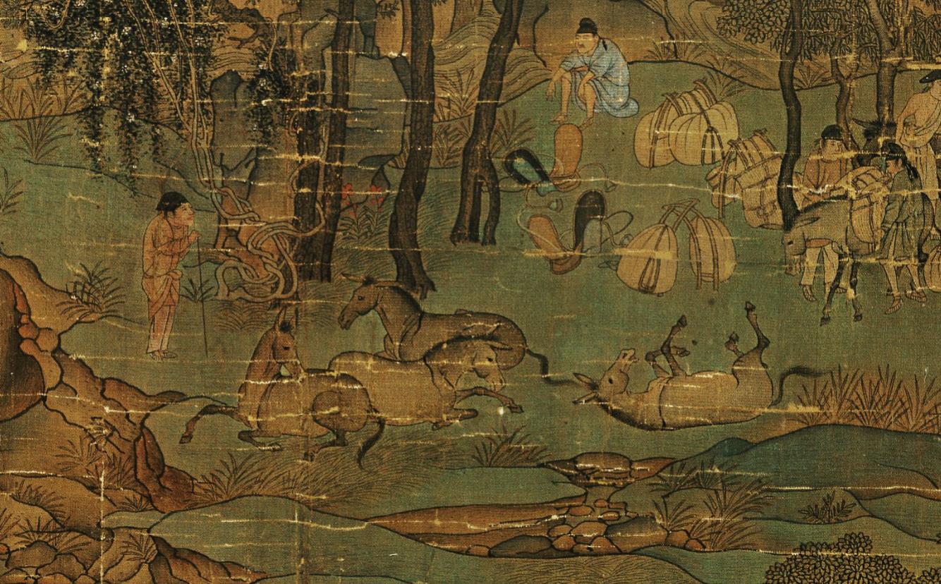 我们一打开这幅图,第一感受就是万仞绝壁,耸入云霄,天际飘动的白云烟霞浩渺,在这险峻的山岭之中,给人以气派宏伟的感觉。山前和山间零散着一些行人,显得非常小。细看这些行人都从容自在,没有逃难时的狼狈相,一派帝王游春行乐的景象。画家把一群休息的人安排在画幅中心,是一个驴队,我看很多资料都说是马,不对,这一行人只有驴和骆驼。驴在地上打滚。特别像《洛神赋图》的开头,人马都在休憩的场景。