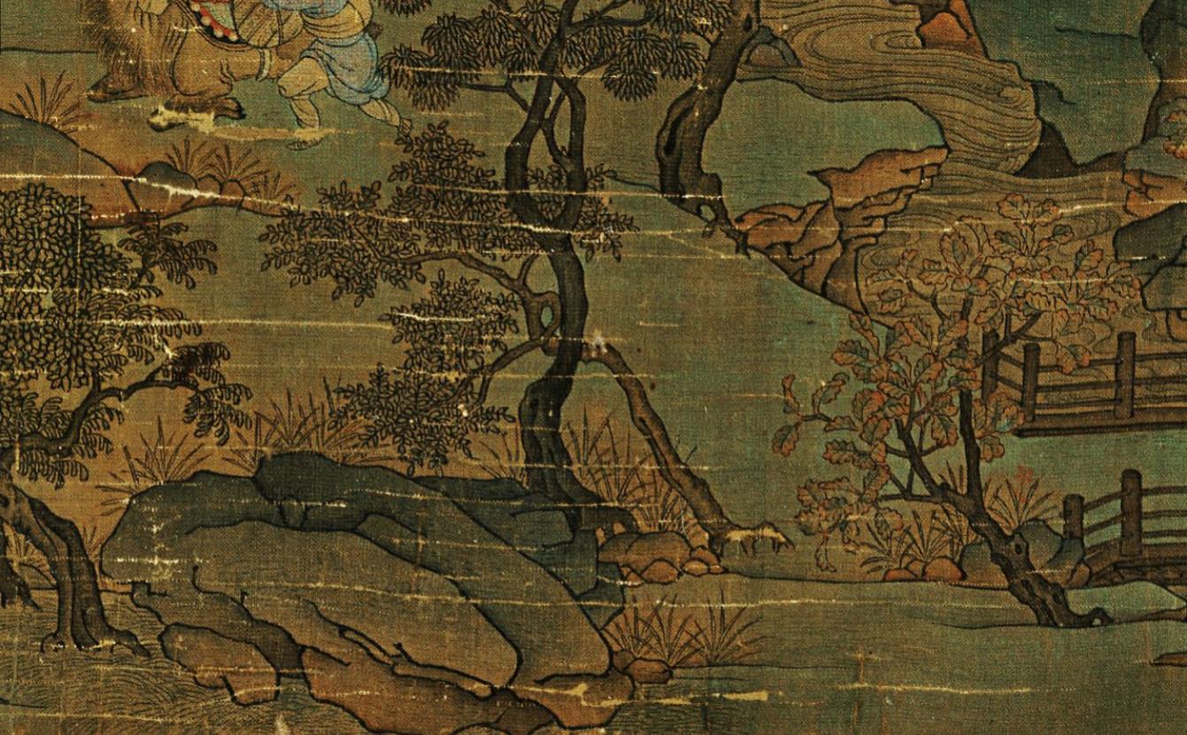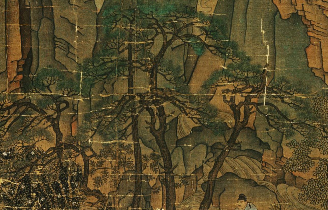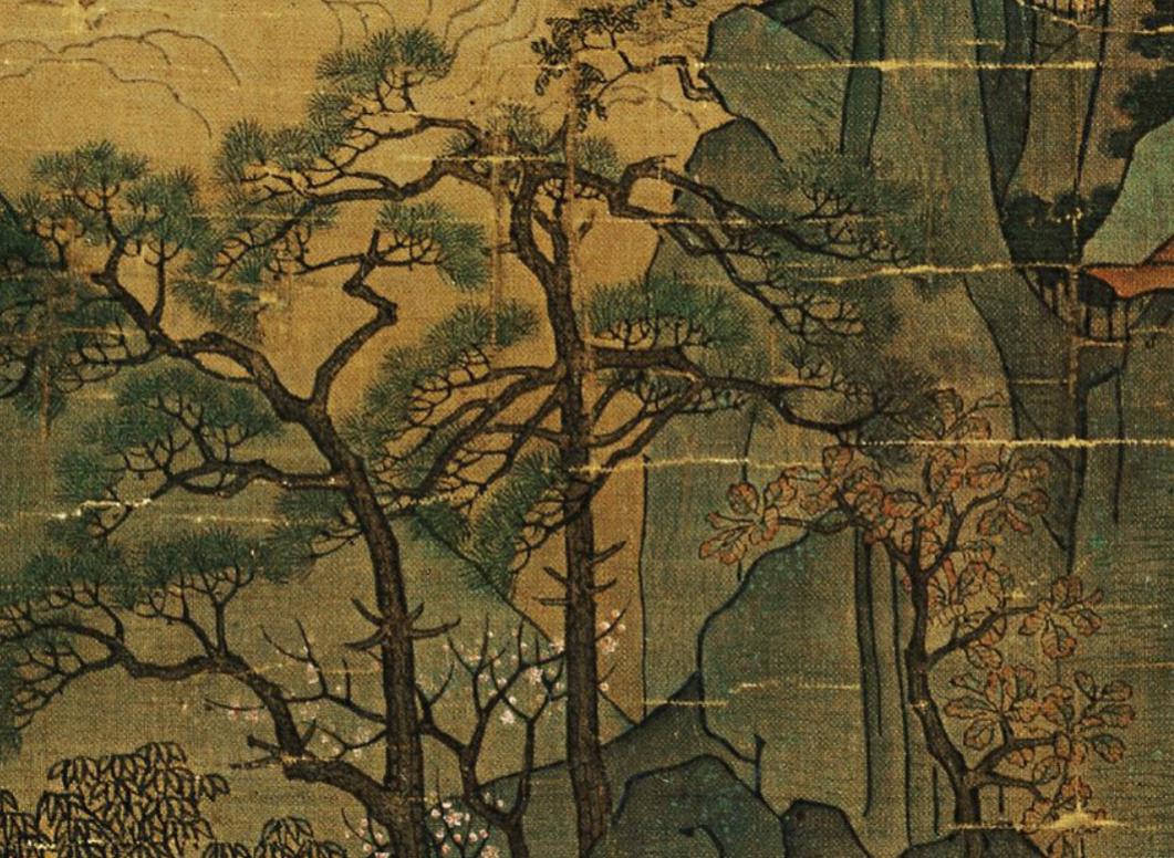 更为难得的还是树的画法,画中有很多种树,树木的出枝技巧跟李思训不相上下,但是有两种树的叶子有明显的进步:一个阔叶树,树叶由绿到黄有个接染,这在之前的绘画中是没有见到的;另外一个就是松针的处理,李昭道继承并且发扬了李思训的技法,首先用石绿染色,然后用墨画松针,但是这里的松针明显更加成熟。
