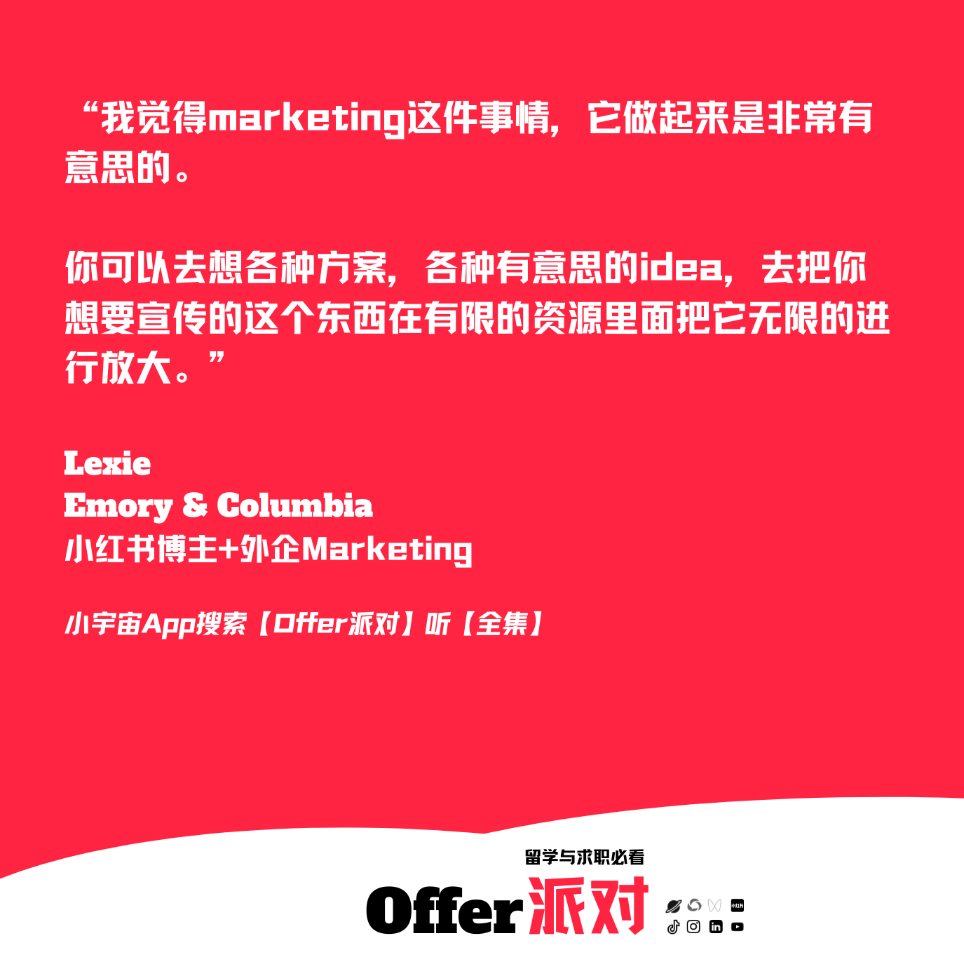 【今天的嘉宾 Lexie刚刚毕业不久,3年读完 Emory 的本科,而且是双专业。毕业后去了哥伦比亚大学,读的是很少见的global thought。她自己也是一个在我眼里非常优秀的小红书博主。她现在就职于一家头部的老牌外资企业的marketing部门。这期节目她会跟我们分享他是如何选择了这些专业,如何找到自己的热爱,如何进入外资企业工作,什么是marketing。如果 Lexie 的这些经历都是你感兴趣的从业方向,那赶快听听吧。】