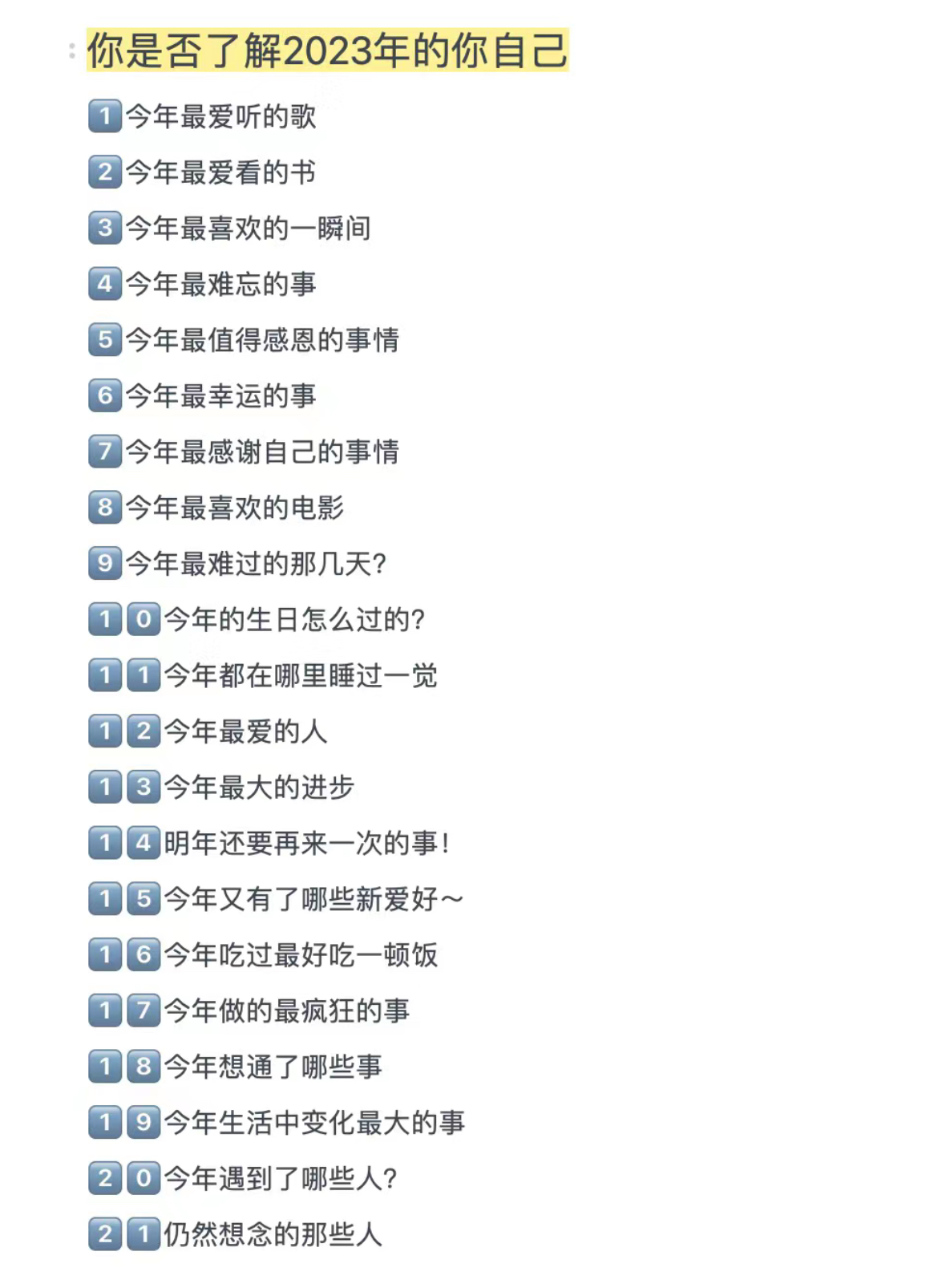 不知不觉已经到了2024,大家的新年过得怎么样?在圣诞节的时候,我邀请了我的朋友和我一起录2023的年度总结,我们从小红书上找到了一个21题的总结,并且和彼此分享,我们聊得很开心,希望大家也可以听得很开心!