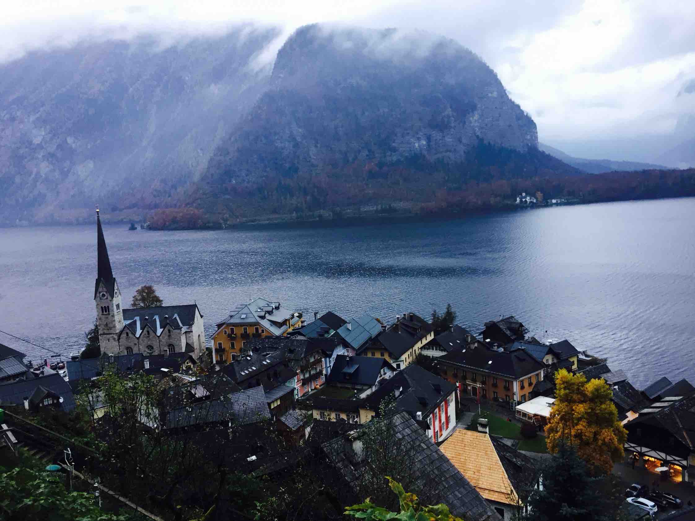 - 菠萝:景点:Hallstatt:标志性钟楼、湖区、远处的雪山