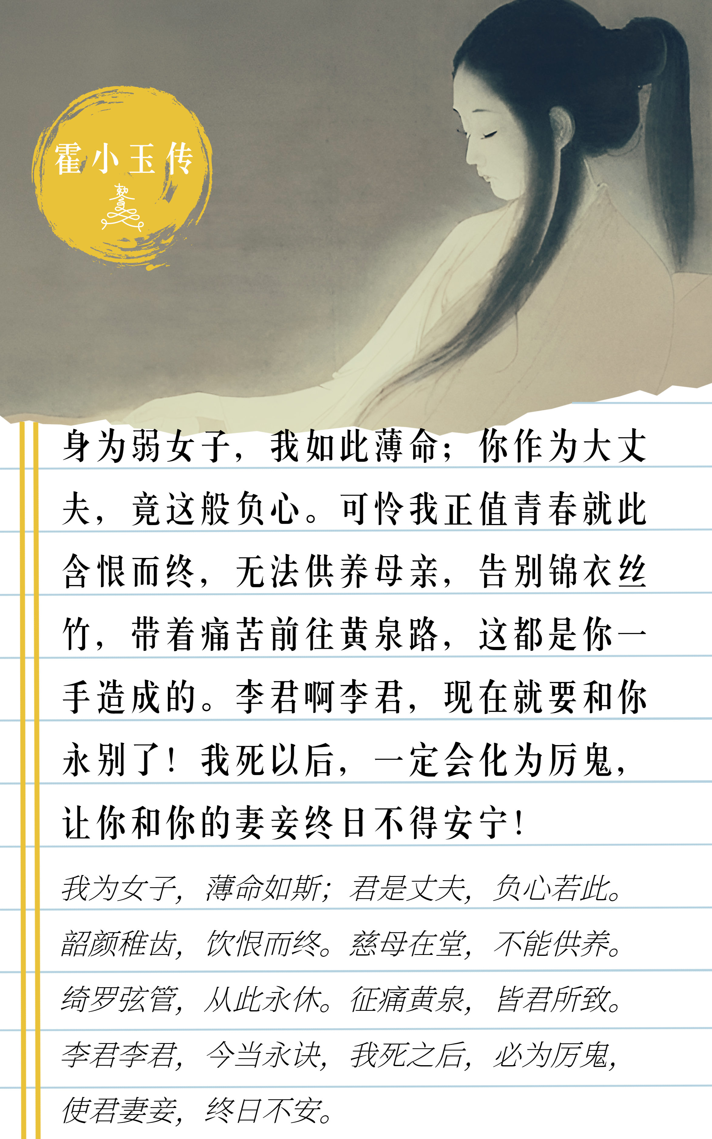 开帘风动竹,疑是故人来。霍小玉见到李益之前,已经先爱上了他写的“开帘风动竹,疑是故人来”。弥留之际,她留给李益一句“愧君相送,尚有余情。幽冥之中,能不感叹?”小玉爱才,李益重色,冤家曾相爱,生死亦纠缠。即便去了阴曹地府,霍小玉所下的咒如影随形,没有放过李益这个故人,而也没有背叛自己的爱恨与誓言。这得多深的缘才会量子纠缠!