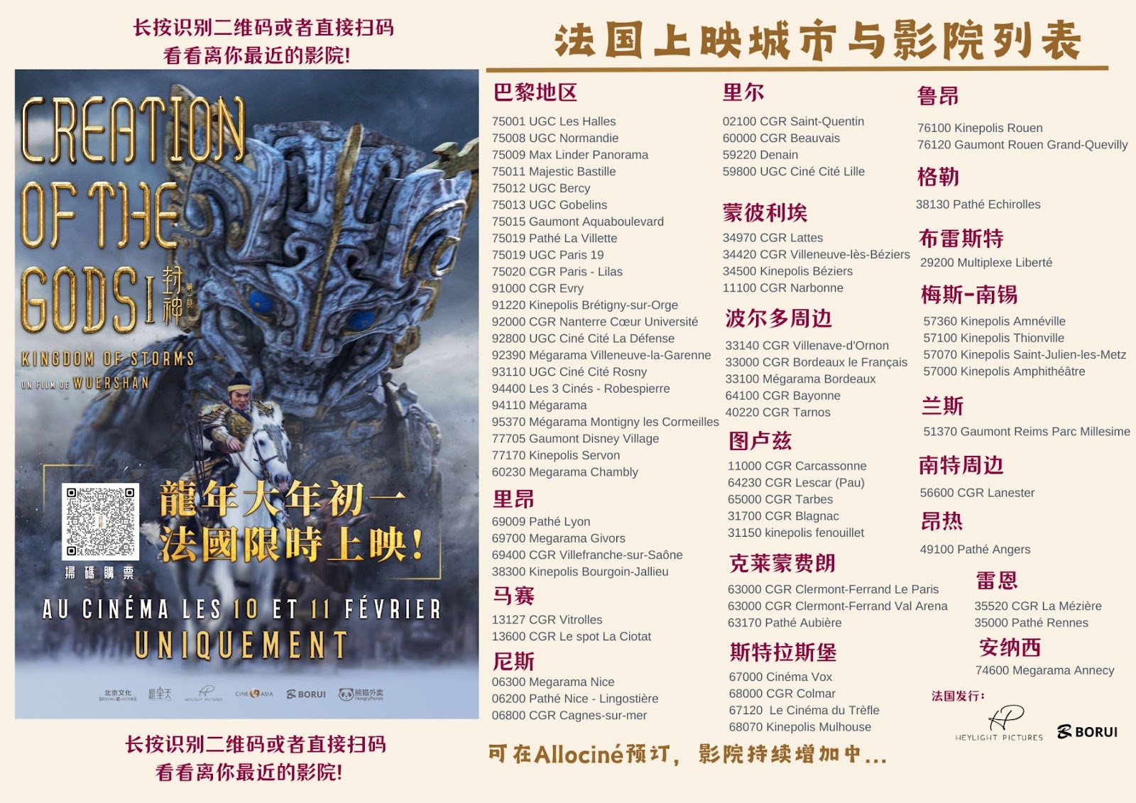 继23年《流浪地区2》在法国十几个城市上映后,今年《封神》排片已覆盖超过了全法60多个城市,巴黎地区也走进了UGC Ciné Cité Les Halles。